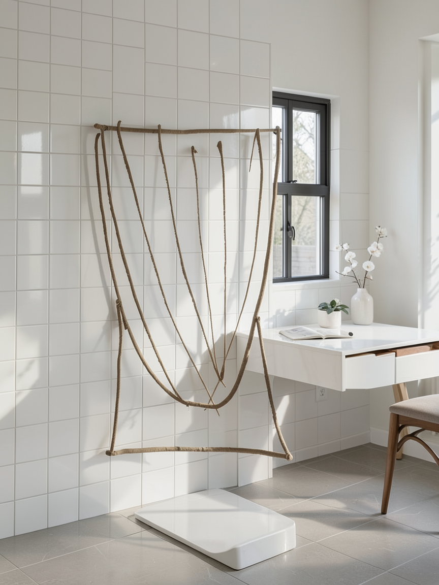 a photorealistic high resolution interior architectural photograph meticulously adhering to the exact geometric composition and axial perspective of the provided wireframe which must remain sacred and un altered the scene captures the multi functional atrium and cafe space looking straight down the central axis from a contained axial eye level perspective the atmosphere is sophisticated and intimate illuminated by highly layered sophisticated architectural lighting that emphasizes the extreme material depth critical instruction preservation of 100 geometric and proportional fidelity to the input control image is mandatory the perspective and relative positions of all structural elements columns furniture tree and floor boundaries must remain identical hallucinated new corridors passages or stray text are strictly prohibited flooring the foreground and entire visible floor area features a highly detailed patterned terrazzo surface with a complex multi colored aggregate matrix of black white brown and pink fragments embedded in a pale creamy matrix no separate concrete area is visible columns and structure all structural columns are finished in a smooth matte coat of complex dark charcoal green paint comparable to little greene attic 2 the prominent vertical sign column on the left features a verbatim vertical lowercase text inscription that reads welkom in sharp white font with the stylized pink and magenta logo positioned precisely directly above it exactly as drawn in the wireframe the right side must not contain any text pergola structure is finished in detailed brushed bronze metal suspension rods are bronze furniture and seating zones tactile refinement the mix of seating is rendered with extreme material definition right foreground group armless chairs are upholstered in smooth neutral taupe wool felt fabric comparable to canyon 0967 0025 taupe the straight foreground bench behind the table is upholstered in supple fine grained distressed aged light grey vintage leather with a refined patina and tactile character the custom built in furniture base surrounding the tree is finished in tactile fibrous warm taupe grey beige felt comparable to little greene ganache 345 the curved booths surrounding the tree feature a highly textured complex dark liquorice colored fabric weave comparable to verotex tobago saba 05 liquorice round chairs with armrests are upholstered in coarse tactile grey beige woven fabric comparable to fabb bjornn 77 tables are walnut topped on beige pedestal bases central feature lighting three large intricate handwoven tear drop shaped rattan pendant lamps with a detailed basket weave texture are suspended low over the central feature and curved booths by bronze rods casting a warm dusk like intimate light with soft realistic shadows walls subtle textured gray concrete stucco main walls behind deep background and general areas right wall features highly detailed layered felt bamboo pattern wall covering caramel base layer date top layer felt large planter box covered in tactile camel beige linen textured wood laminate decolegno alpaca fd32 filled with tall feathery grasses ceiling textured gray concrete stucco featuring several large floating circular acoustic panels finished in taupe grey beige felt precisely in their wireframe locations deep background kitchen service counter main counter body is linear textured pale wood grain laminate decolegno reflex fd06 with precise dark green attic 2 edges countertop is polished white quartz with subtle soft grey veining quartzform veined deco 915 deep back wall is covered in textured vertical wallcovering vescom tonga 1082 12 slatted bronze detail over the kitchen plants large mature multi trunk ficus tree with highly detailed bark and vibrant lush green leaves is the central focus in the custom built felt furniture base tall feathery grasses fill the right planter refinement focus on extreme photorealistic details texture definition for all tactile fabrics felt leather woven rattan textured woven fabric concrete stucco wallpaper accurate light behavior reflections on polished surfaces concrete terrazzo quartz material depth and absolute structural precision matching the wireframe render in 8k high fidelity professional architectural photography style preserving the provided structural layout as the single mandatory constraint