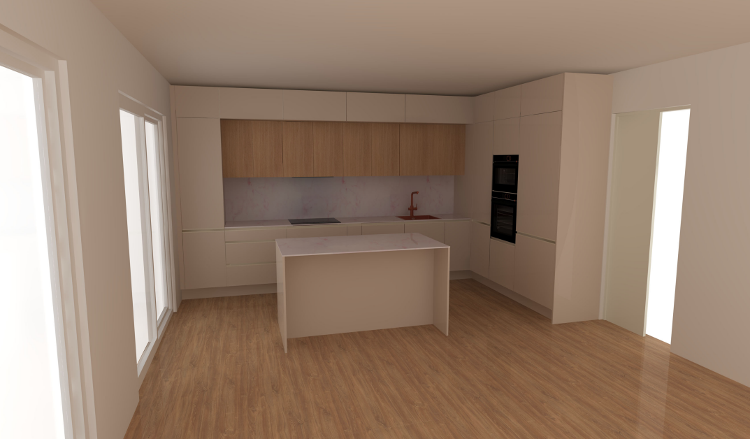 to the visible part of the island attach a padded dining bench the height of the bench backrest the same as the height of the island and a table and only two chairs beige chairs and cushions wooden table decor a pendant light over the table deska ostr vku nep ekr v z da lavice