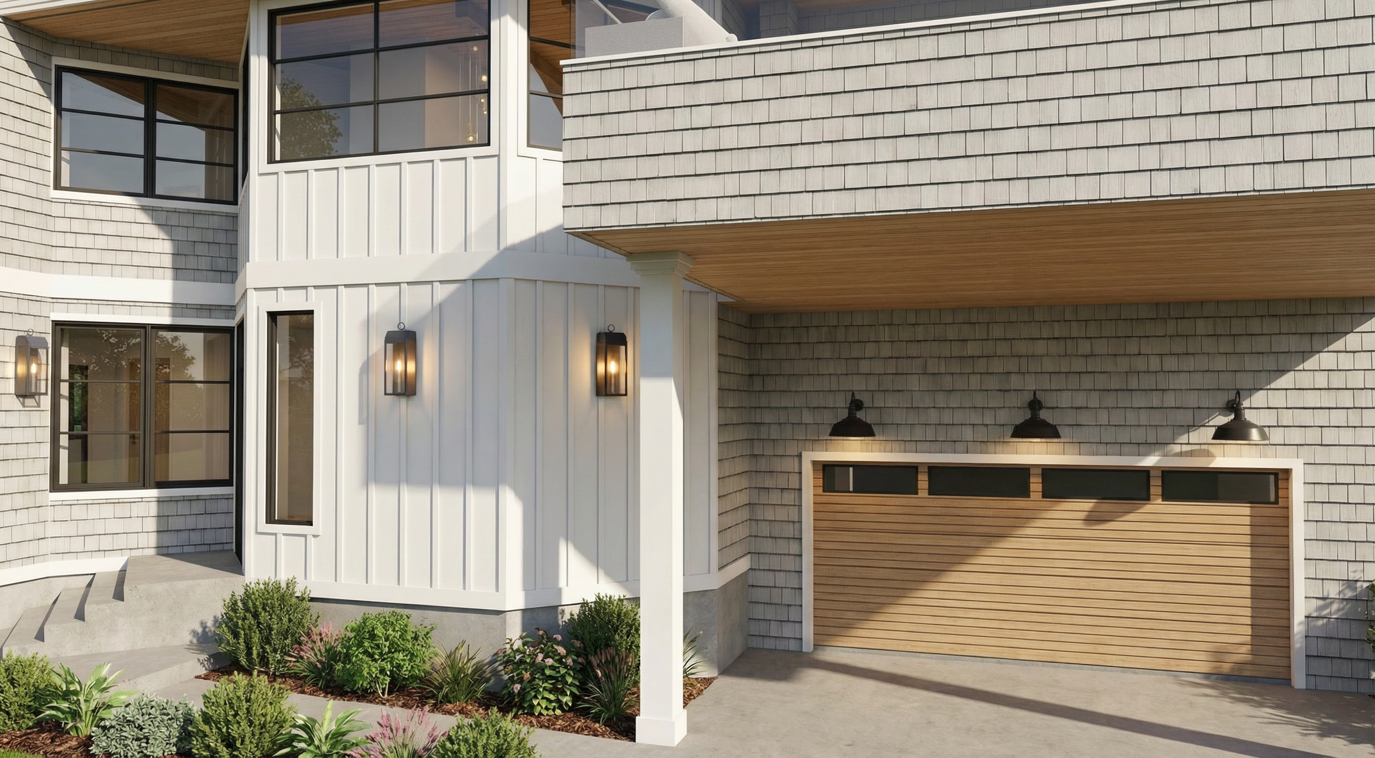 recreate this photorealistic rendering of this exterior keep all details finishes as is but remove light over front door
