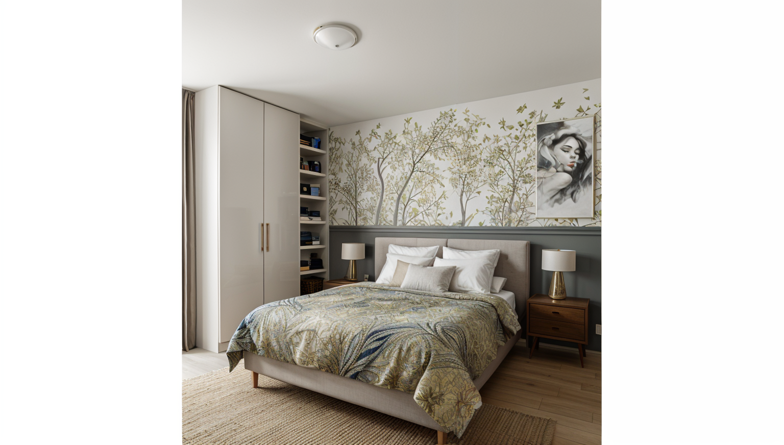 supprime les portes de placard et remplace les par un rideau en lin fix sur un rail au plafond supprime le tableau sur le mur du papier peint supprime la table de chevet gauche du lit remplace le plafonnier par des spots directionnels conserve le reste