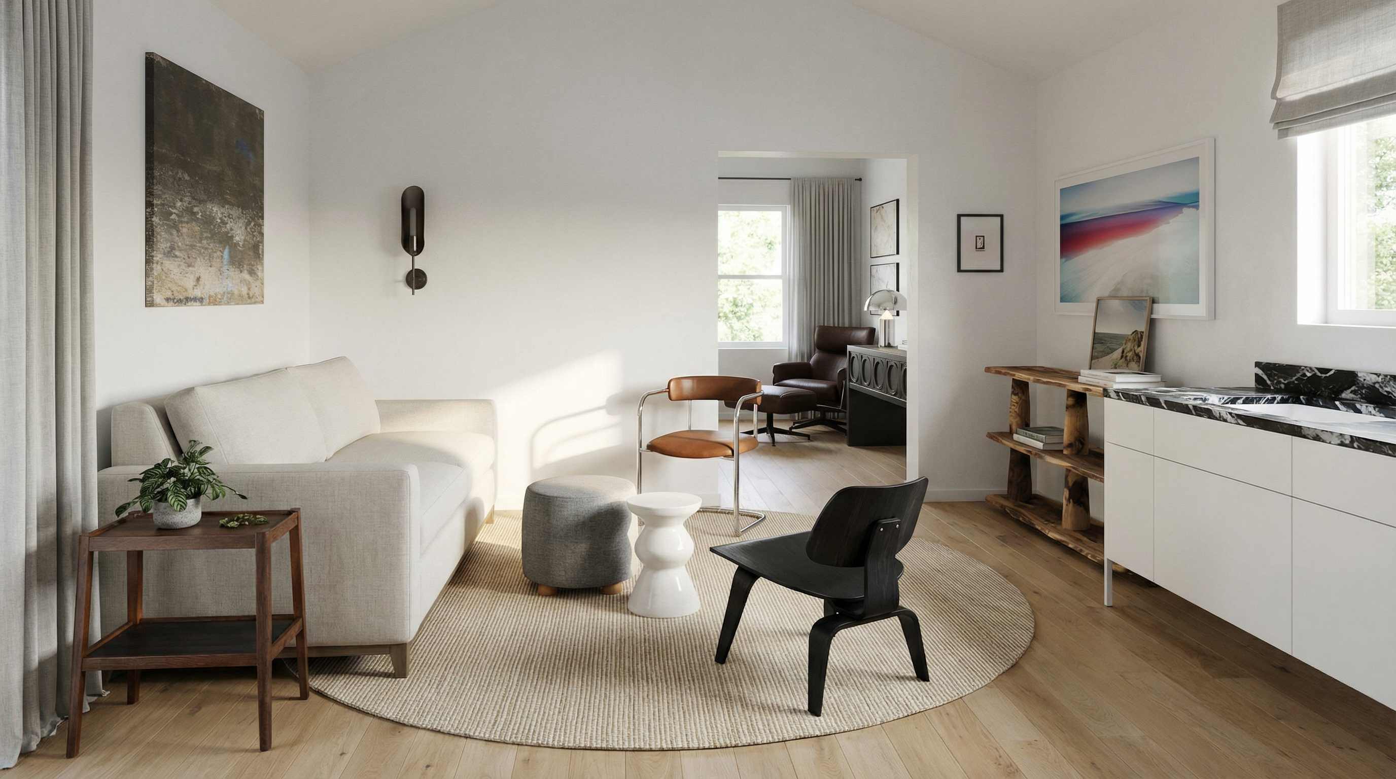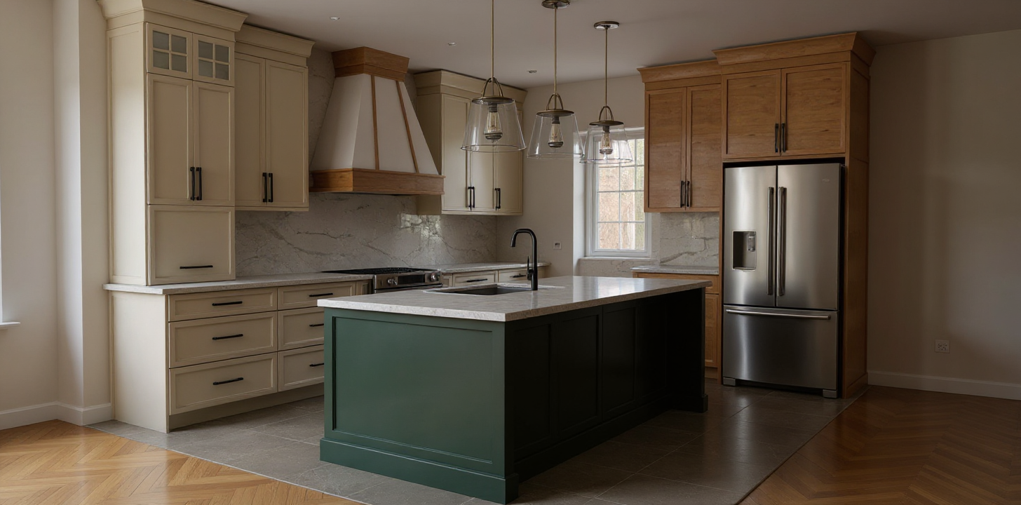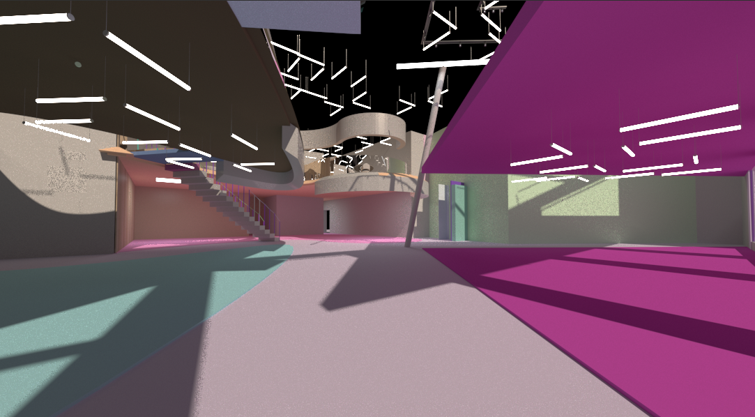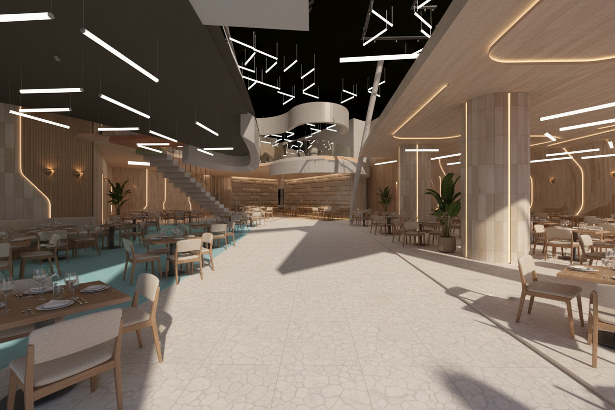 add neutral colors add dinning sets to the designed area for restaurant add some wall designs to it and add maybe more lighting fixtures and make the ceiling color more exaggerated the purple and blue floor area should be in different material from the middle flooring lines