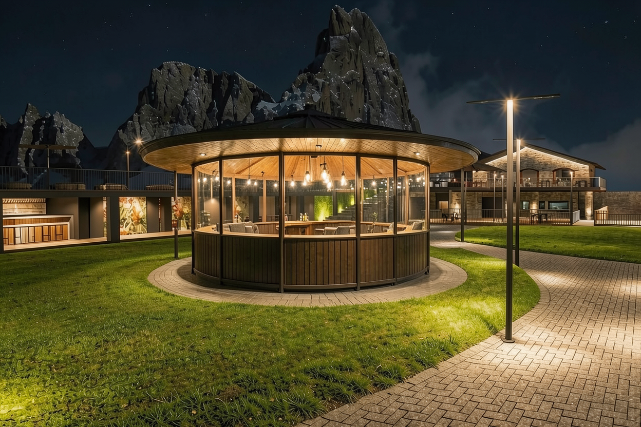 monumental cinematic lounge bright white ceiling vast architectural volume organic marble terrazzo floor large circular sunken seating pit carved into the floor stepped edge recessed lounge area rotating circular mid century sofa inside the pit rich textured upholstery with deep pile and tailored seams warm mineral architecture with curated bold accent objects high end collectible design atmosphere wide angle architectural visualization