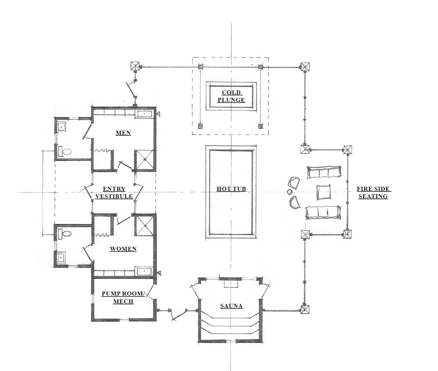 make this traditional with shingle siding gable roofs and traditional windows the structures should match the layout plan and only be one story the sauna should have large windows