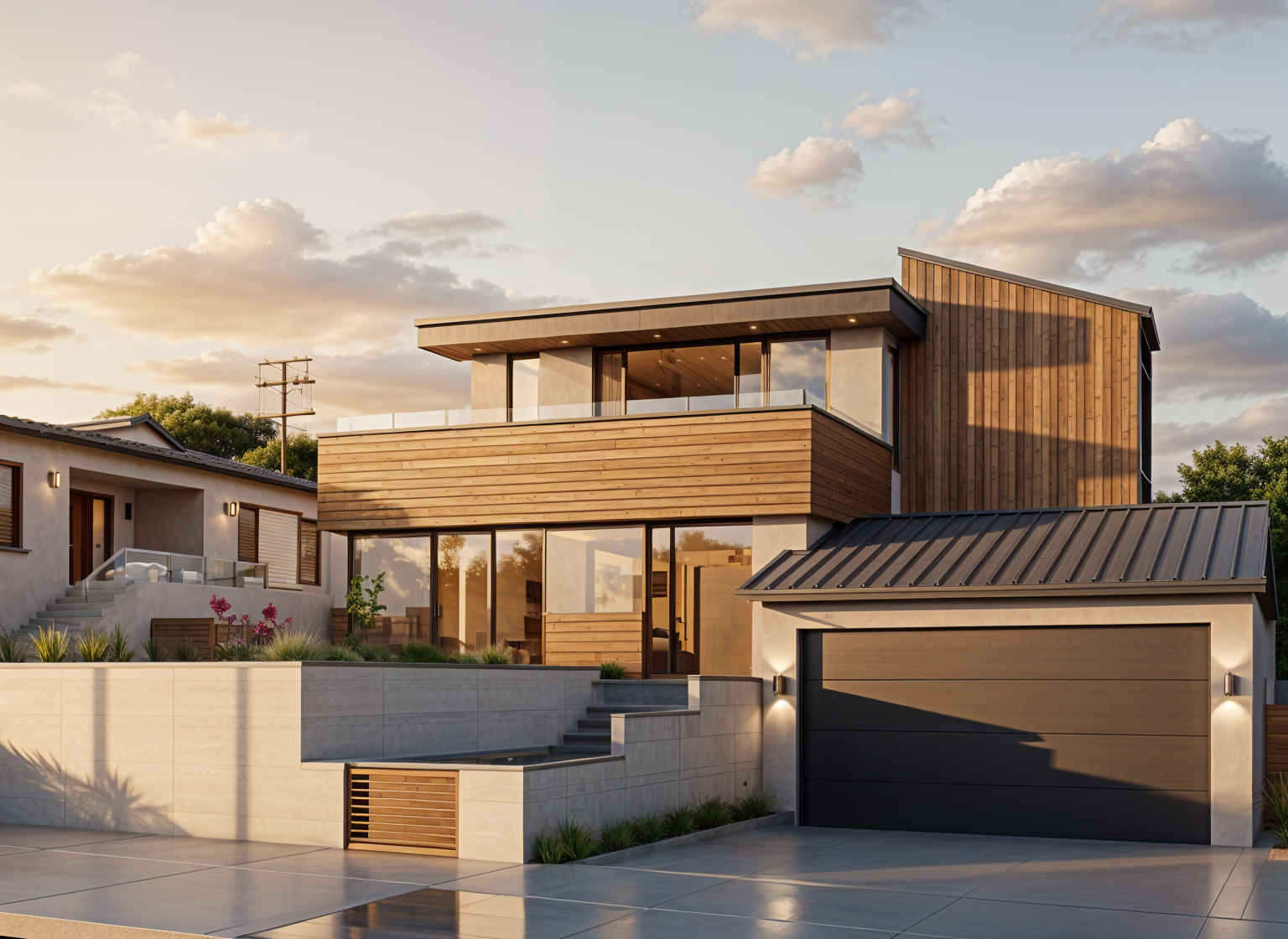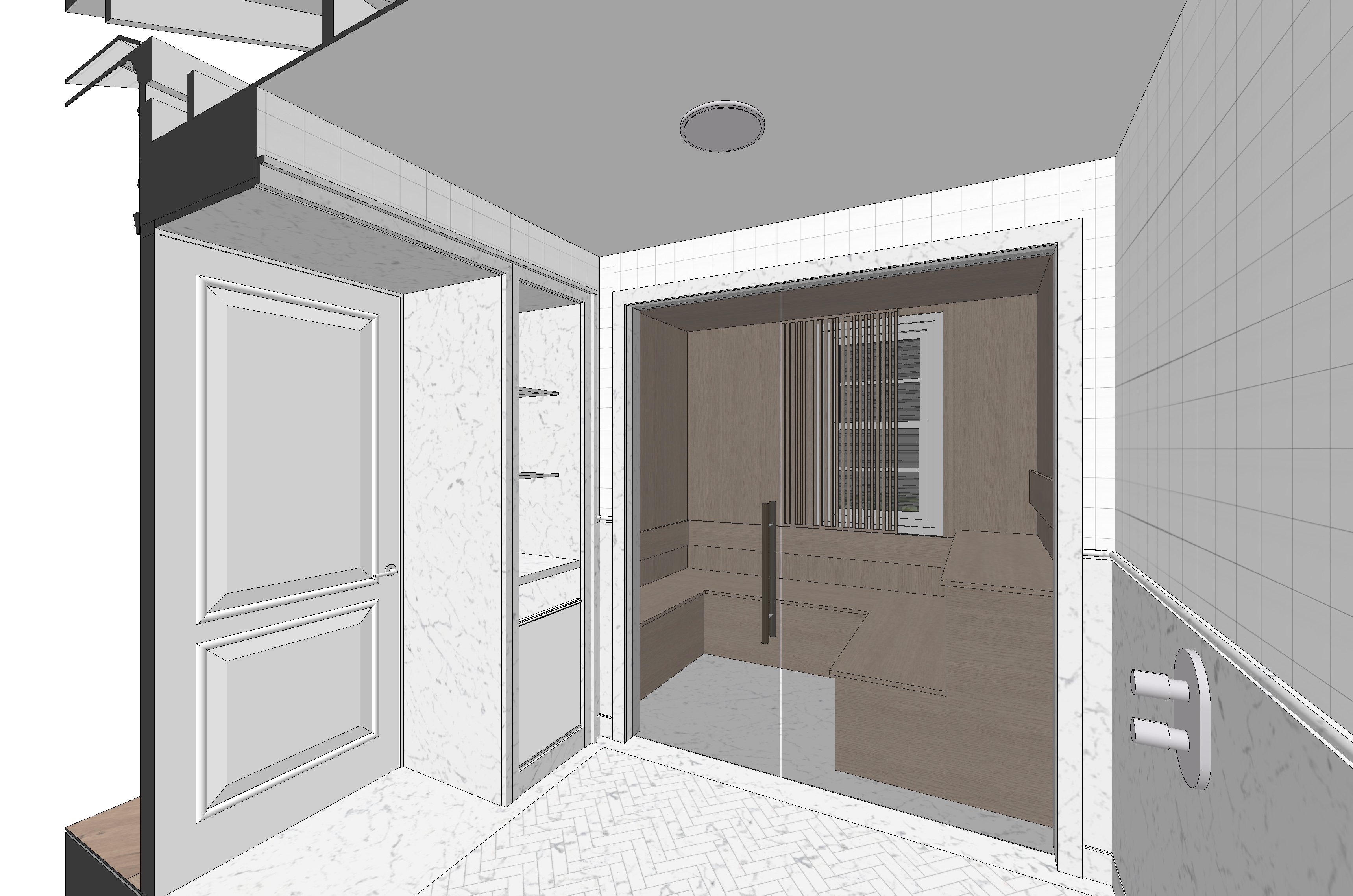 shower room trimmed in calacatta marble with oak sauna visible through clear galss beyond white towels on glass shelves in niche sunlight from foreground the sauna should not have a shower or a wall sconce large rainhead shower head in center of the room