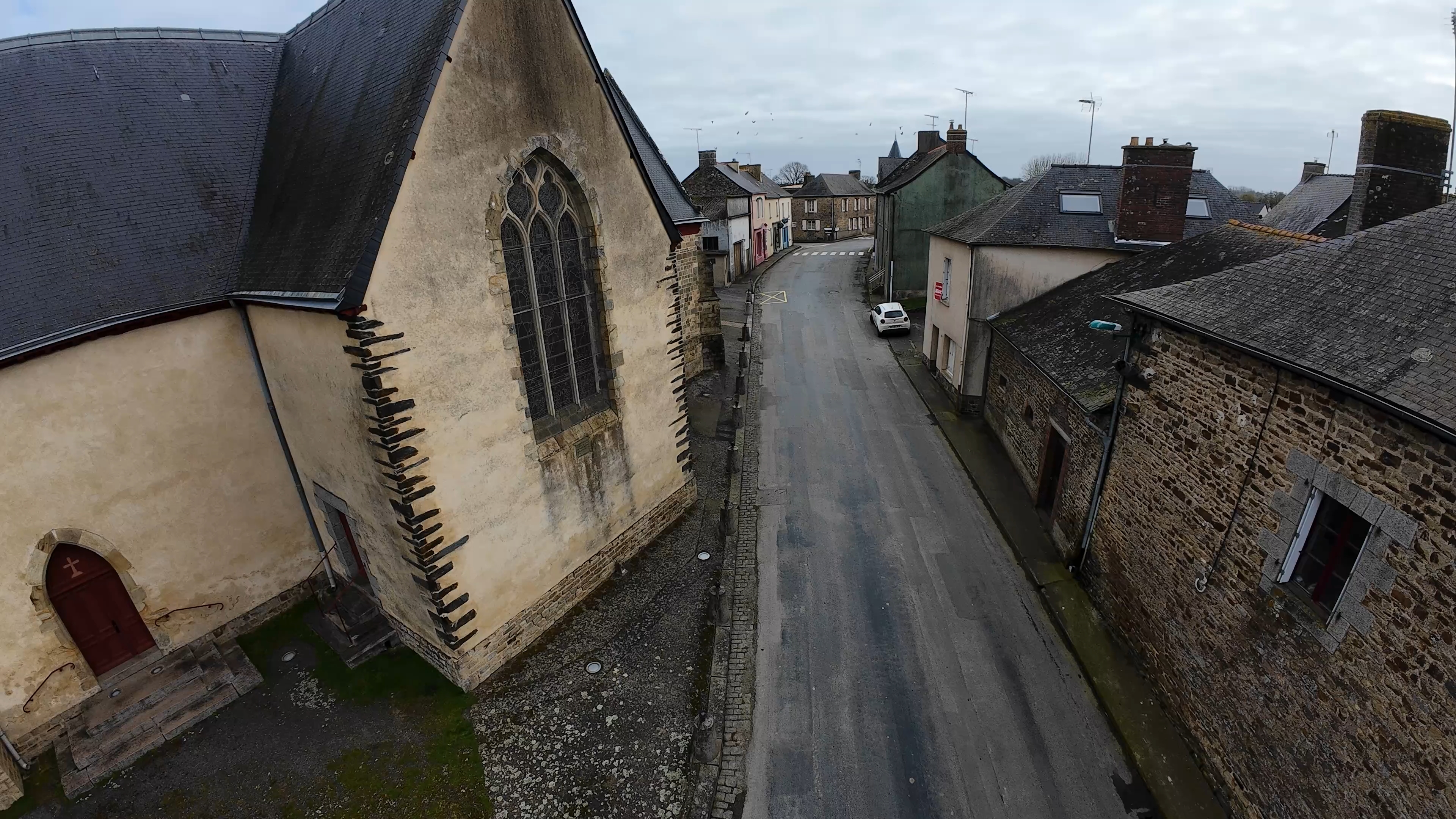 render a serene picturesque village street highlight the rustic church with weathered stone walls in light beige accented by darkened aged roof tiles emphasize the large arched stained glass window with a subtle blend of muted colors like deep greens and soft blues capture the narrow winding cobblestone street in shades of gray leading the eye through the scene on either side depict charming buildings with textured stone and brickwork in earthy tones like warm browns and muted reds add a soft overcast sky in light gray capturing a calm and peaceful atmosphere with light scattered clouds to enhance the tranquil mood