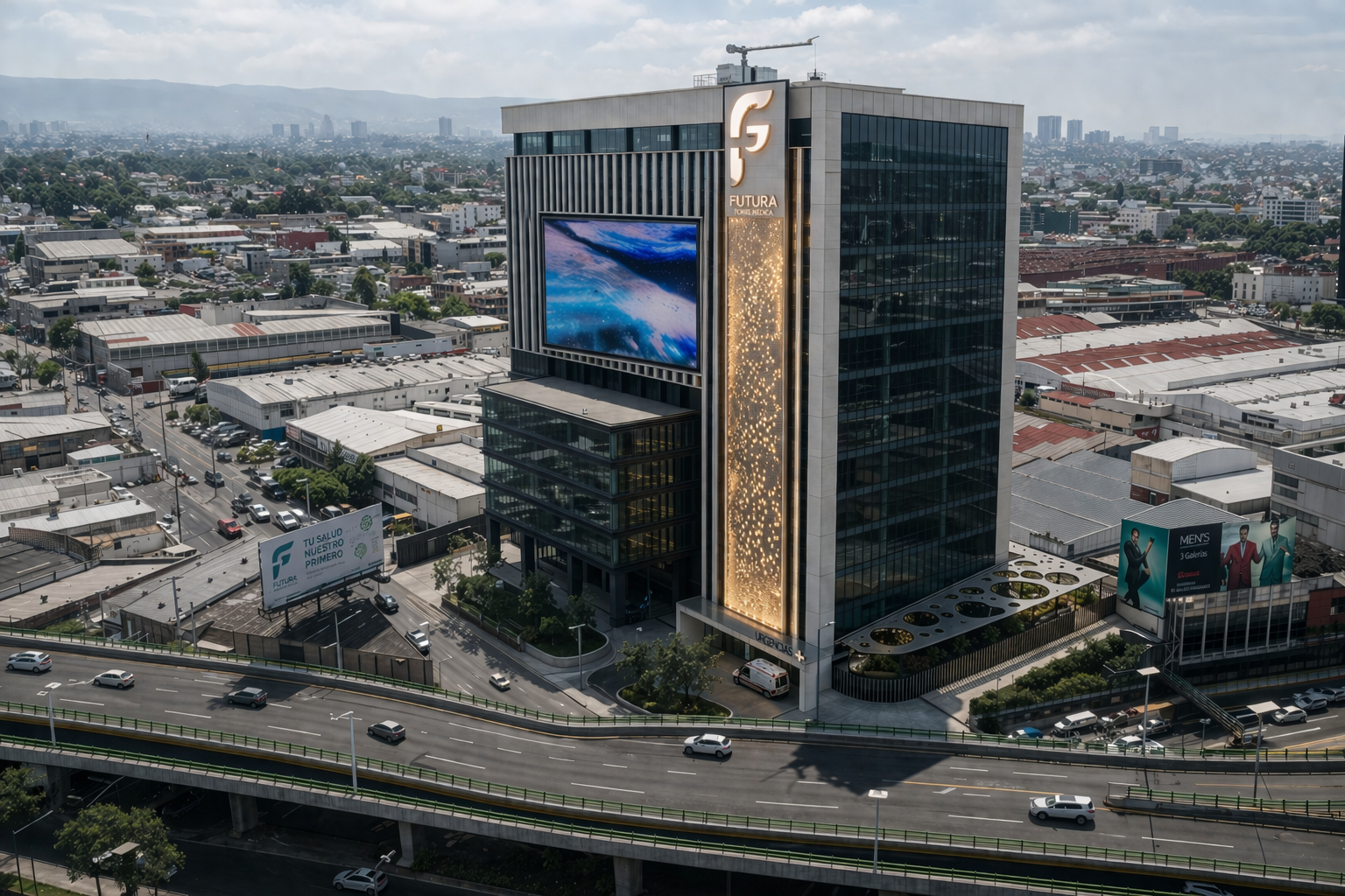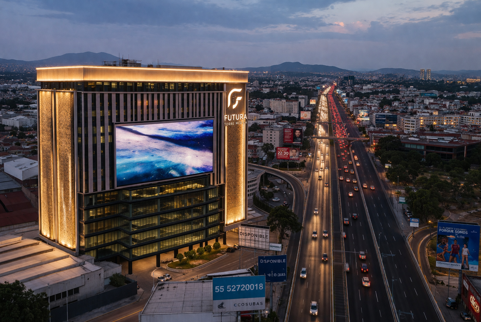 exterior shot create a stunning 3d rendering of a modern architectural building the building facade should have a sleek exterior made of reflective glass panels in shades of azure blue and silver incorporate a rooftop terrace with lush greenery add vibrant lime green for landscaping elements like trees and bushes surround the building with a clear sky in soft pastel hues of pink and orange set it at dusk to create a serene and elegant atmosphere highlighting the building s modern design