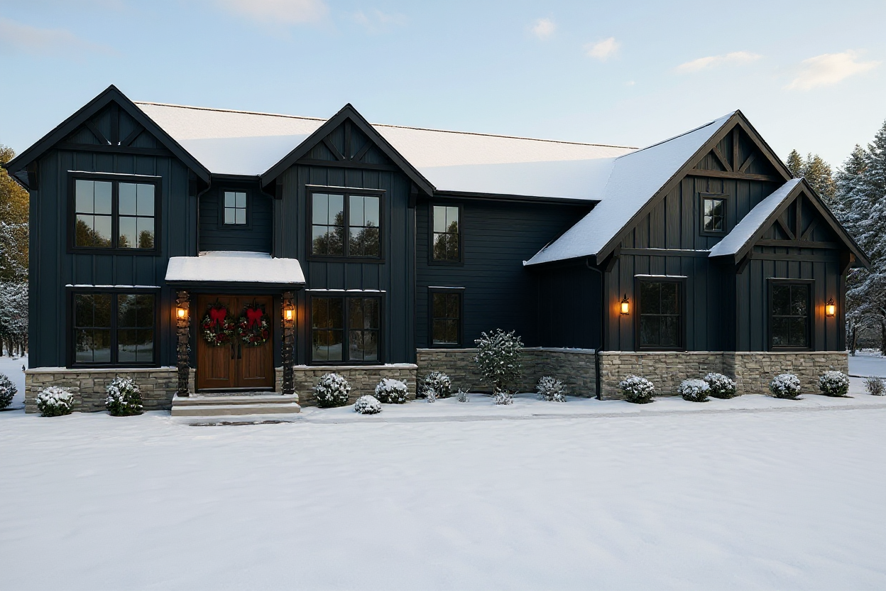 i need all 10 windows to have black trim around them keep the snow and everything else as is add 1 light fixture to each side of the front door on the left side of the house