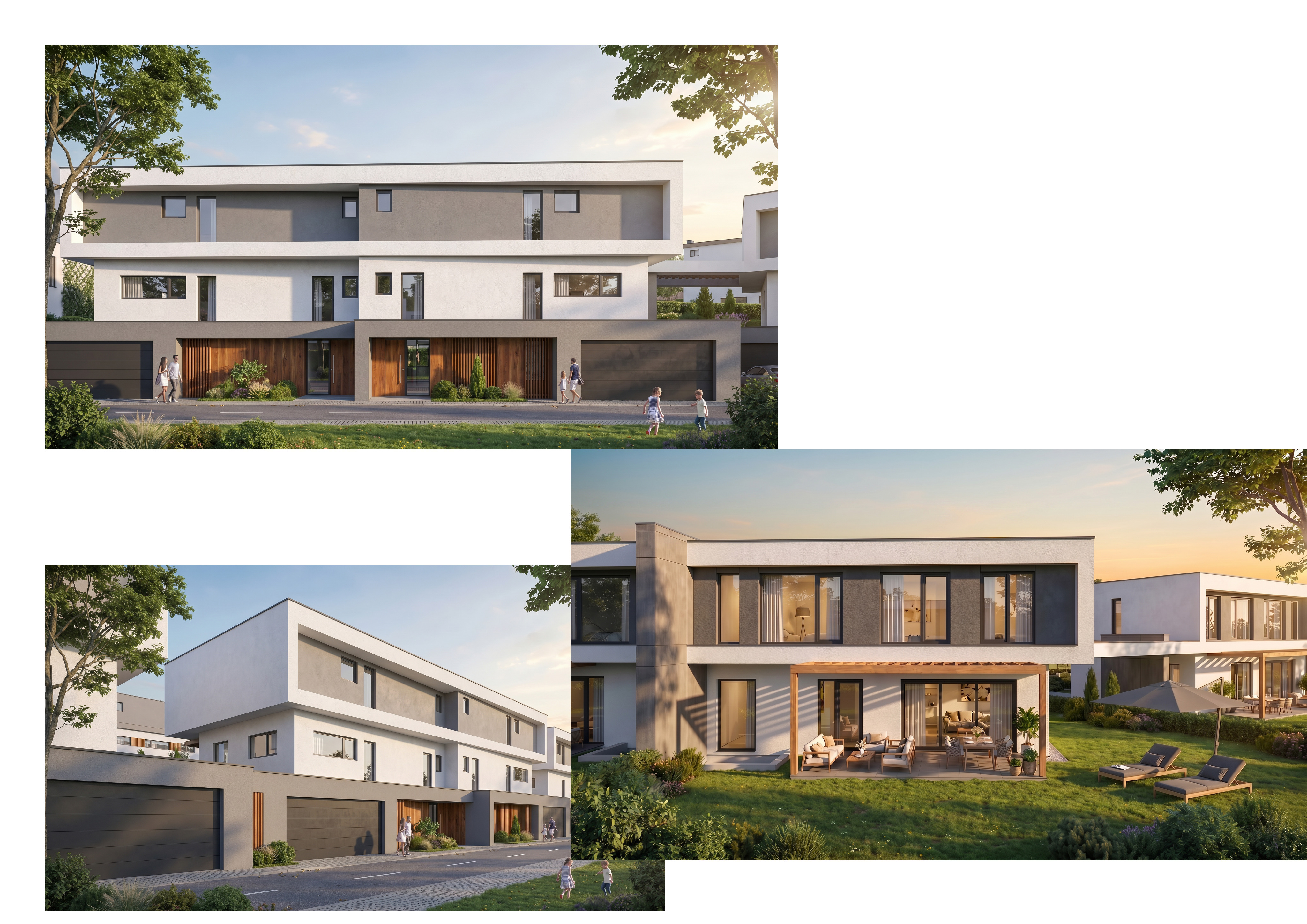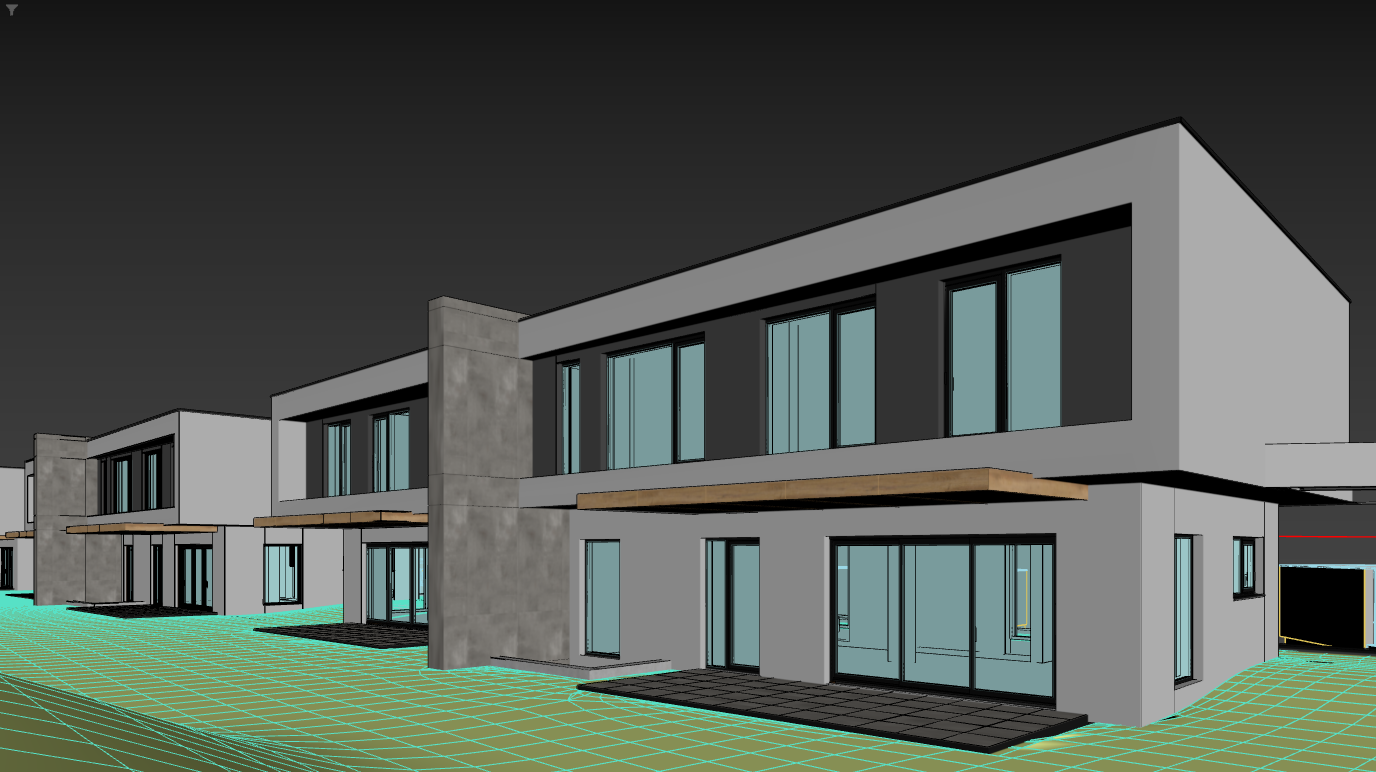 exterior shot use materials from mood board make white facades white stucco make grey facades grey stucco make vertical element with grey concrete tiles make cantilever above porch from wood enhance materials don t change anything from geometry don t change perspectice