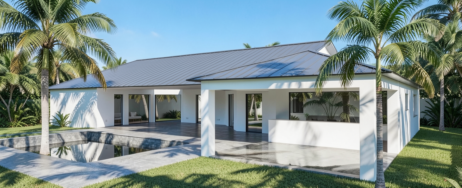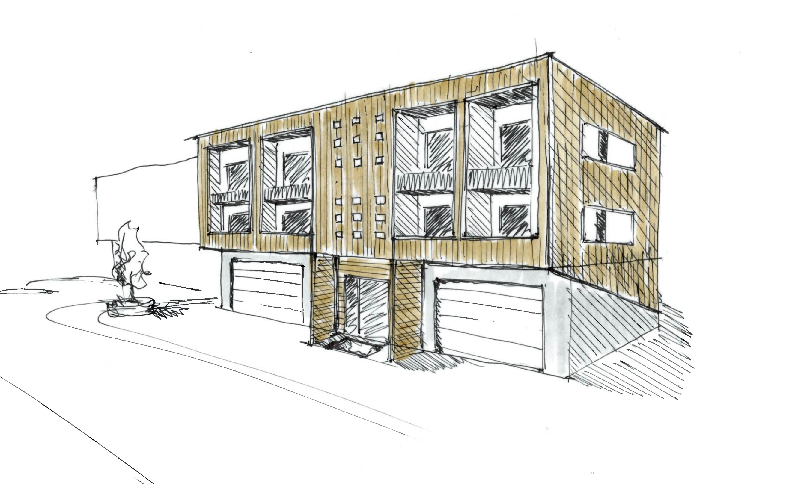 modernist exterior shot a modern two story building with a wooden facade featuring vertical and horizontal lines colored in warm oak tones the windows are large with sleek dark gray frames below two white garage doors contrast with the dark charcoal gray base of the building a small elegant sculpture is positioned beside a curved driveway surrounded by lush greenery the atmosphere is serene and contemporary bathed in soft late afternoon sunlight with clear blue skies creating a harmonious and inviting ambiance architecture