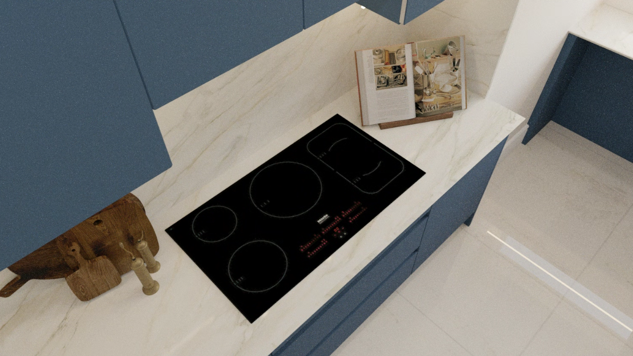 improve the lighting and make the blue slightly darker don t change anything else maybe add a saucepan on the hob