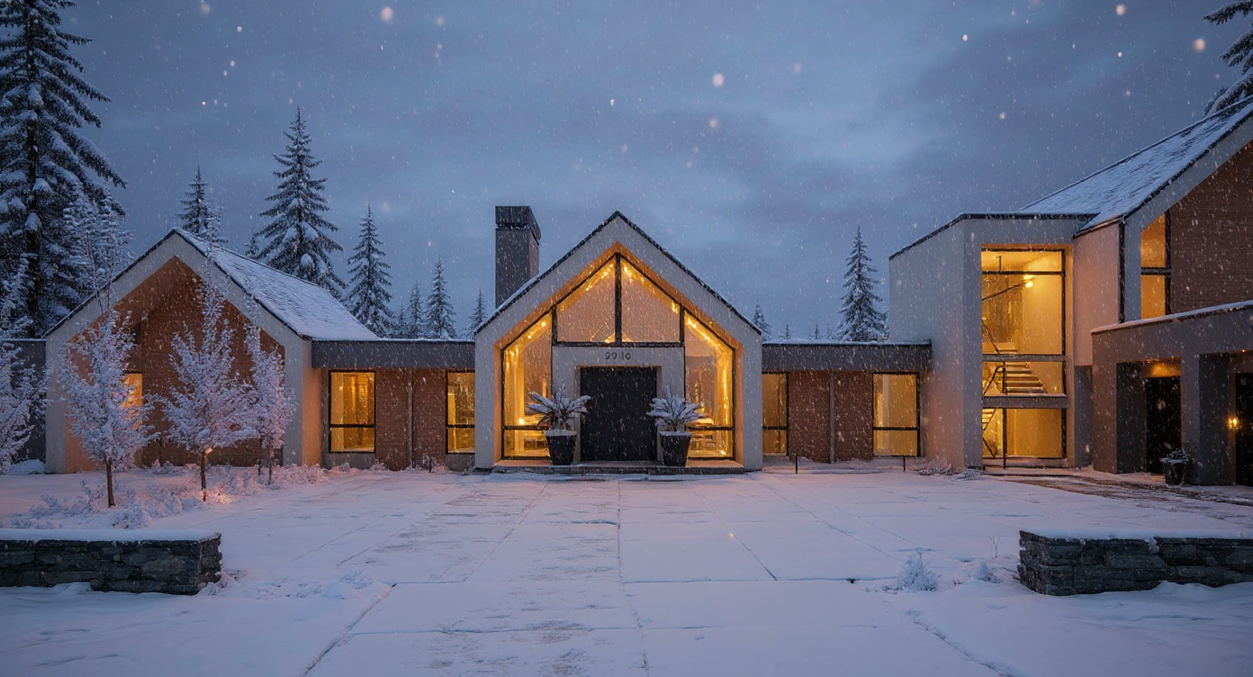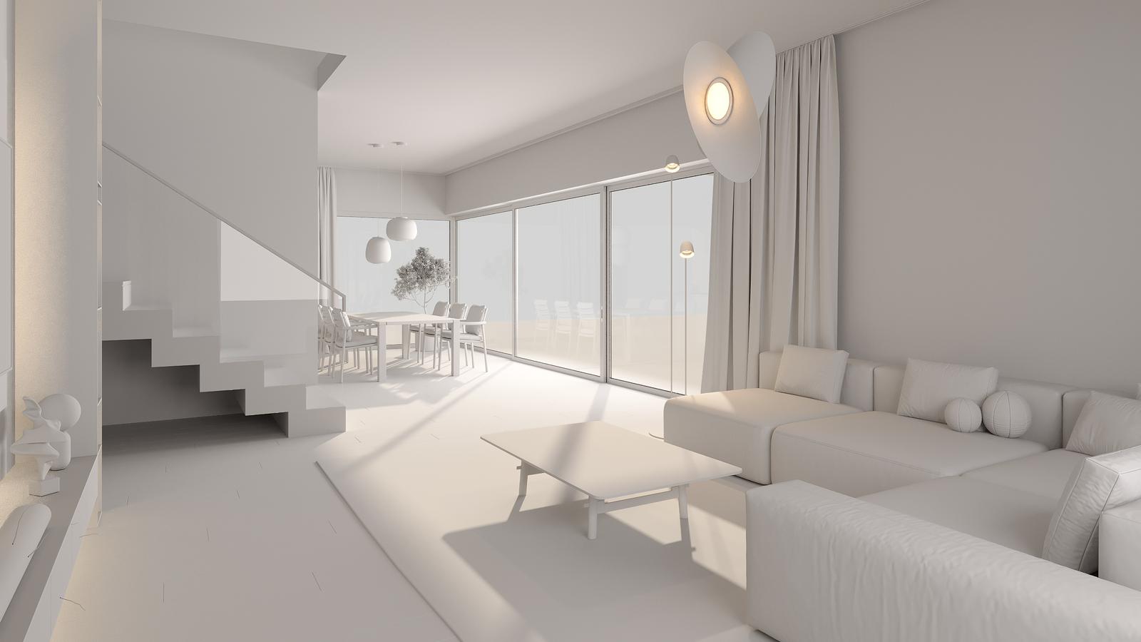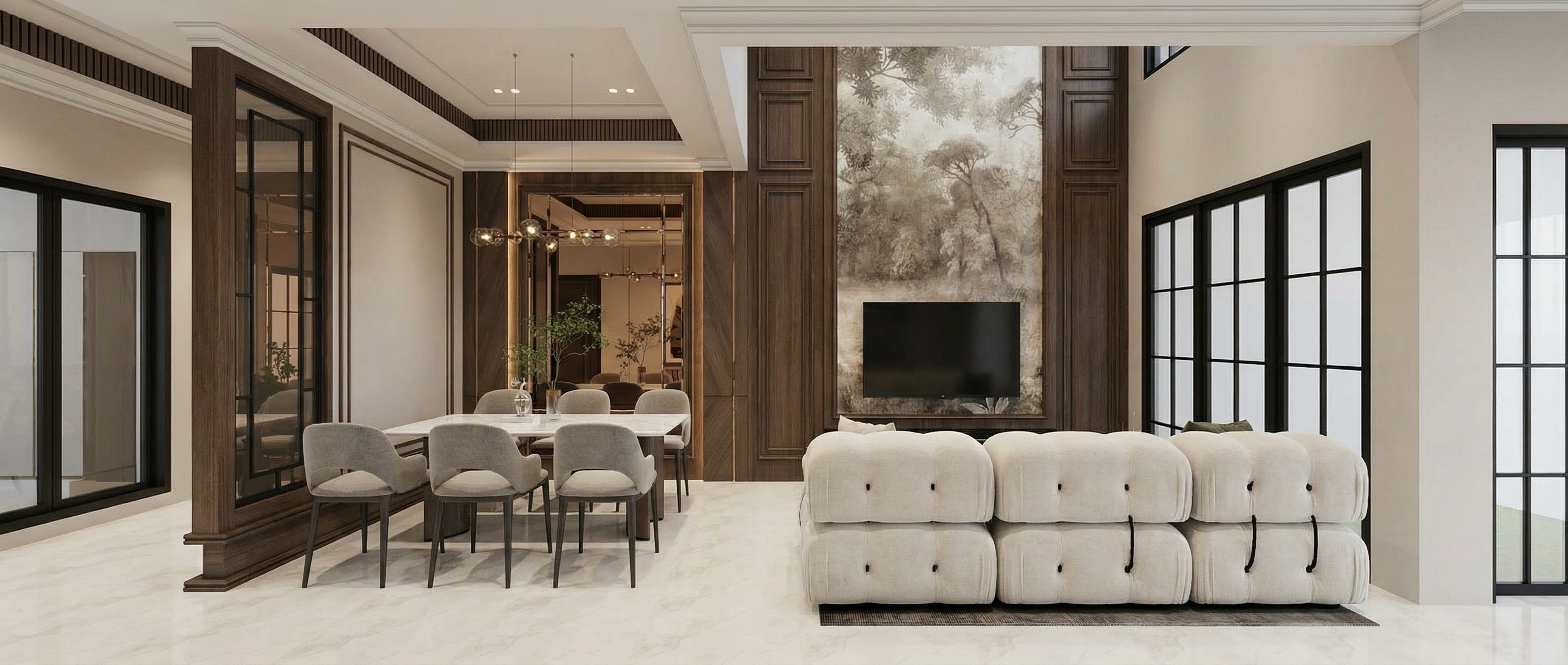 you are a render specialist generate a modern architectural render with a scandinavian style with natural daylight warm earthy tones wide wooden plank flooring cozy dining area with large wooden table and woven pendant lights bright and airy space with large windows and sliding glass door opening to terrace and greenery minimalistic light colored sofa on cream rug two round coffee tables