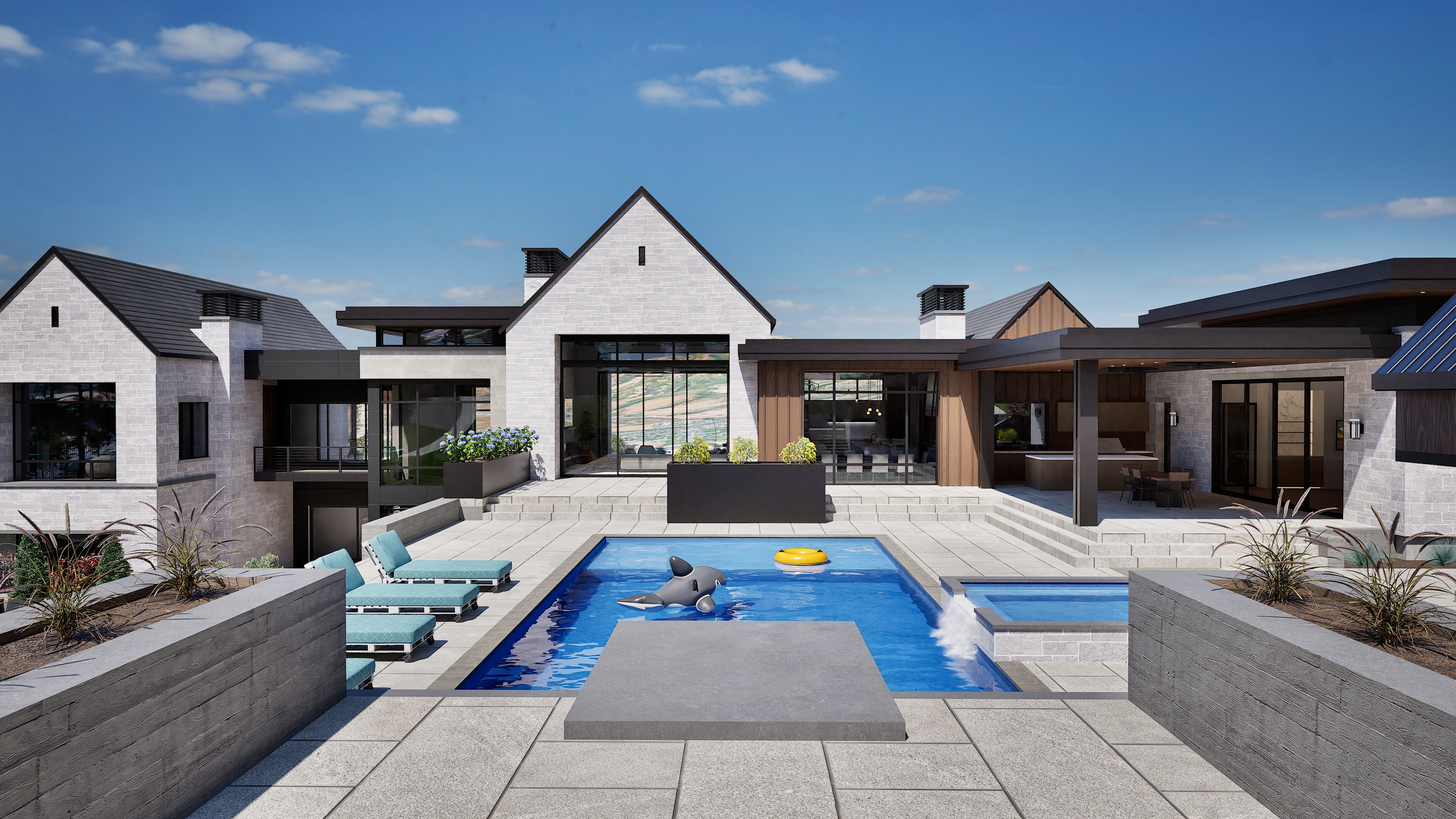 don t change the structure i want the environment to feel like a bright cool summer day with fluffy clouds in the sky change the pool chairs to be more realistic add lights illuminating from the interior make the exterior materials feel realistic with better shadows and textures make the vegetation more realistic i want the image to feel photorealistic make the pool water more realistic