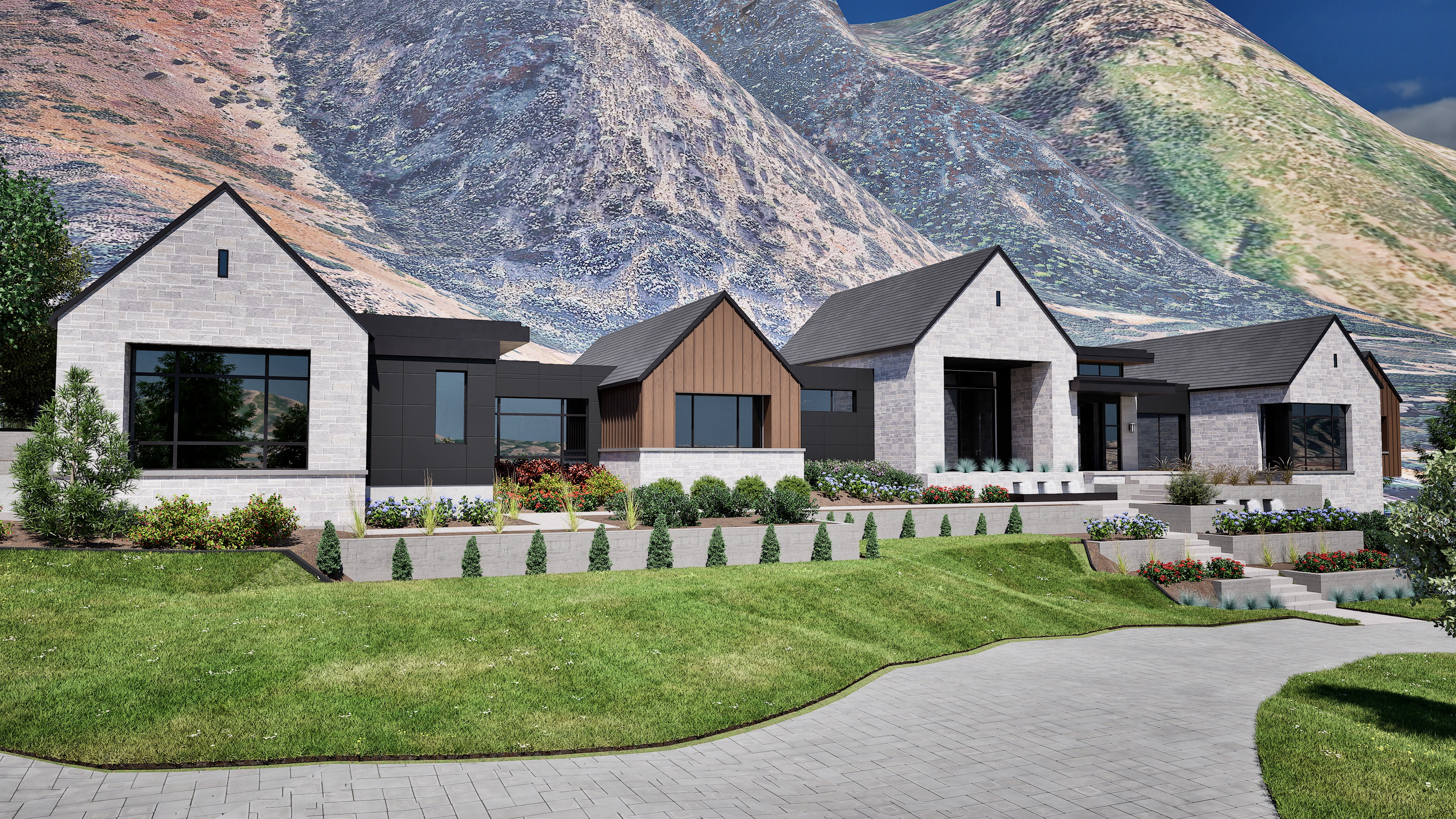 don t change the structure enhance the materials shadows and lighting to feel more natural and realistic the exterior stone will be a white dry stacked stone keep the shape of the mountain in the background but add dense trees to it