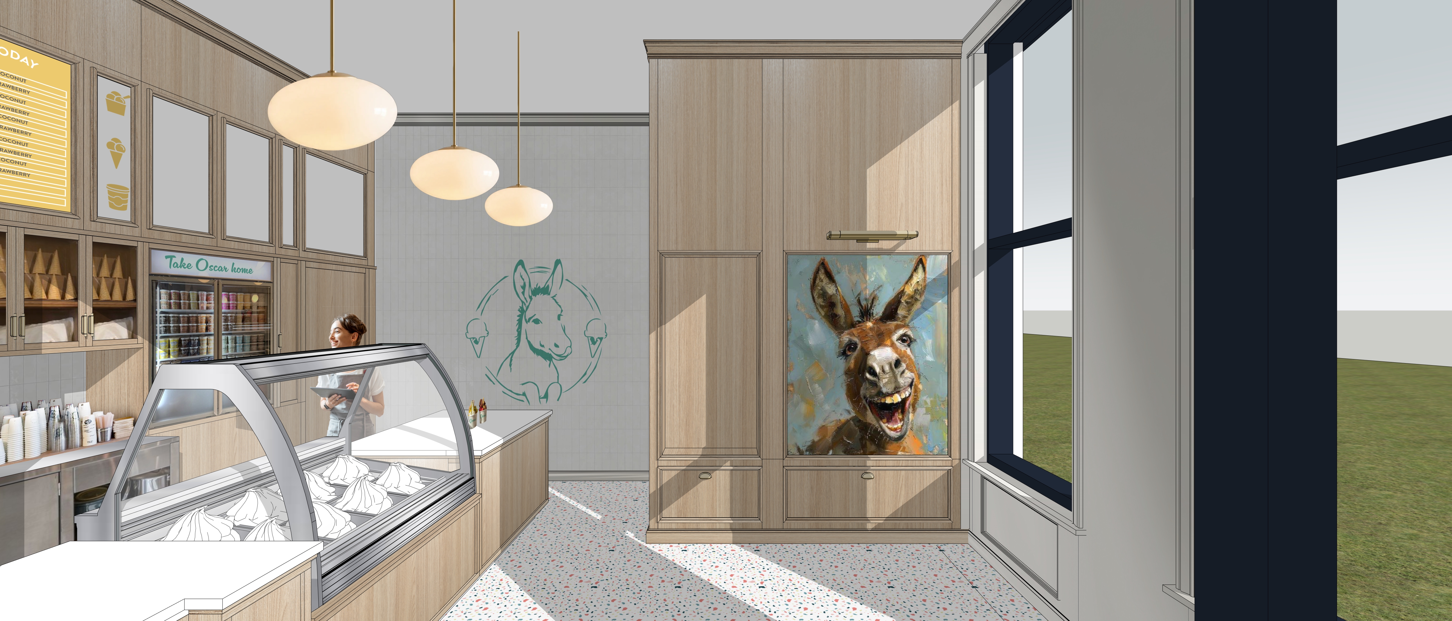 interior render of an ice cream shop sof lighting colorful gelato in the display case