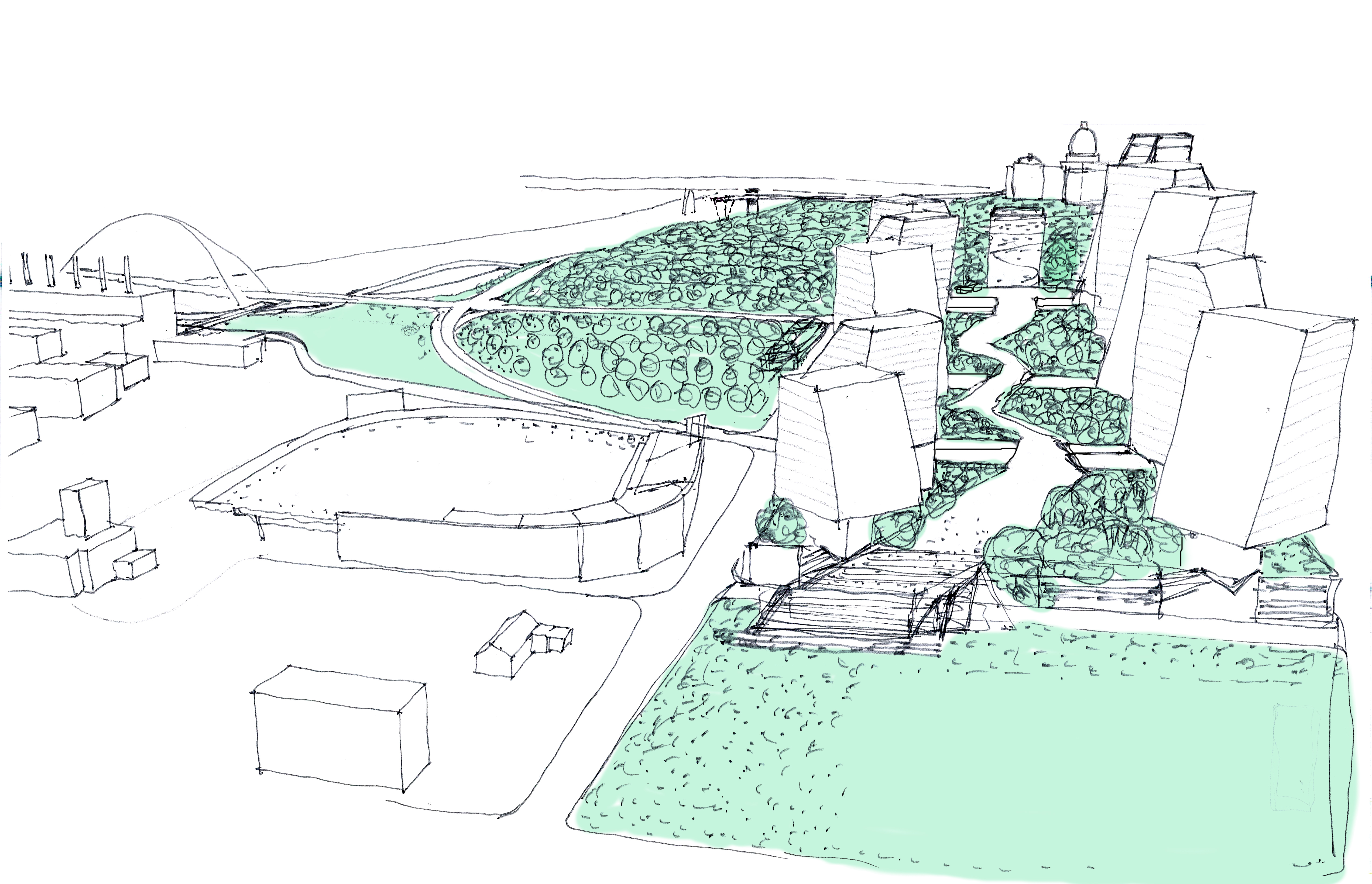 an aerial architectural rendering set in valley sunny day image fades into mist in the distance buildings are modern glassy with plants on terraces grass lawns with some trees in foreground