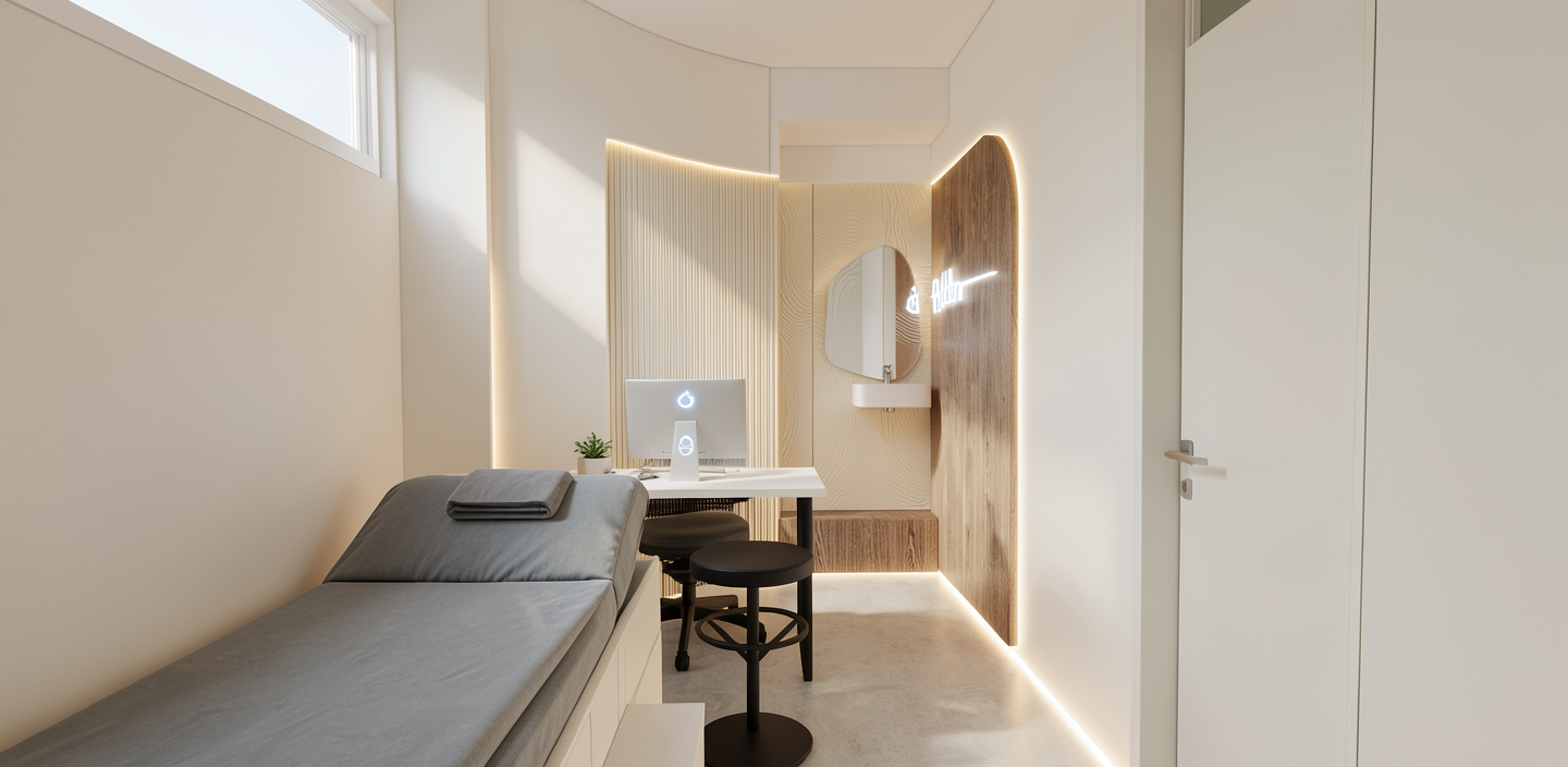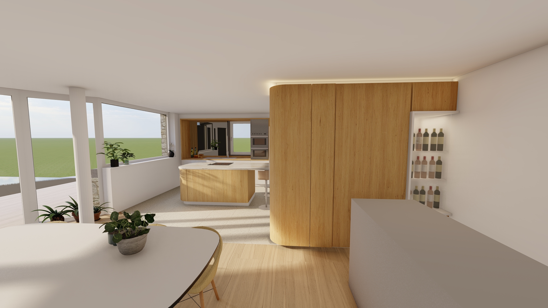 please transform this image into a highly realistic render with natural midday lighting maintain the original composition proportions and materials keep the led light above the cabinet and enhance it to look more realistic with accurate light diffusion and a subtle glow the led strip must cast its light upward toward the ceiling creating a soft indirect lighting effect and realistic light interaction with the surrounding surfaces