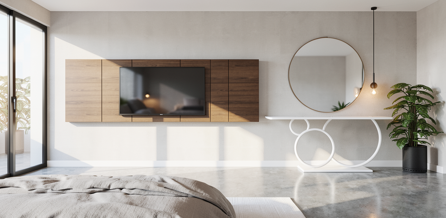 crea una imagen fotorrealista a partir de este sketchup el mueble tocador tiene la encimera y la base en color gris y los circulos color crema