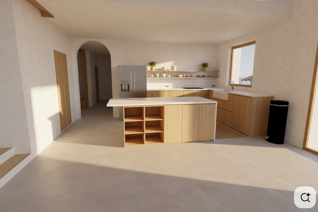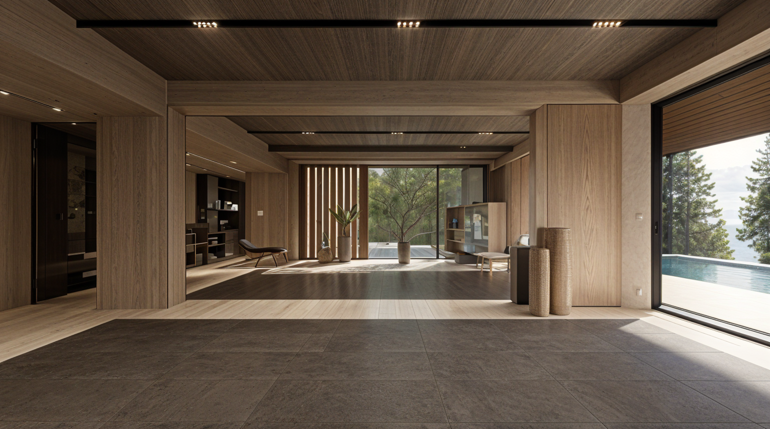 create a highly photorealistic architectural render of this gym interior visualization using the provided reference image as the exact base preserve all colors materials such as wooden panels concrete textures glass surfaces thick fabric rug on the floor with realistic fibers and subtle wear metal equipment frames and stone elements material structures wall geometries object shapes positions and overall layout precisely without any changes do not alter volumes proportions or arrangements ensure the large dark mirror prominently reflects the fitness equipment including the bench press aweczka stationary bike rowerek and treadmill bie nia with accurate perspective and lighting enhance realism with ultra detailed textures subtle surface imperfections and lifelike reflections on glossy surfaces including the mirror implement realistic lighting soft natural daylight filtering through large panoramic windows and glass doors from the outside pool area and surrounding pine trees mountains creating dynamic soft shadows god rays piercing through vertical slats warm ambient ceiling spotlights with realistic light falloff and subtle lens flares and bounced indirect light highlighting wood grains rug texture and floor details for depth and immersion render in high resolution photorealism as if captured by a professional architectural canon eos r5 camera with 50mm lens f 4 aperture emphasizing sharp details natural depth of field and atmospheric perspective architecture interior gym photorealistic