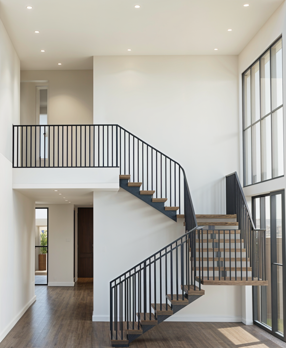 convert this architectural rendering into a highly realistic editorial style luxury real estate photograph of the entry foyer with floating stairs absolute constraints no creative liberty maintain the exact architecture stair configuration tread thickness spacing railing design wall positions ceiling height flooring layout and all materials exactly as shown in the input rendering do not redesign restyle reinterpret enhance or modify any architectural element do not change stair proportions tread thickness riser spacing guardrail type handrail profile or structural details do not add artwork furniture d cor rugs lighting fixtures plants trim details or architectural elements do not remove anything flooring stair treads flooring and floating stair treads are builddirect white oak wide plank see reference image maintain exact plank width layout direction and proportions as modeled stair treads must match flooring exactly in tone and finish finish must match the reference image matte ultra low satin sheen no gloss no reflective shine soft neutral white oak tone subtle natural grain movement light tonal variation between boards surface should appear smooth and natural not polished not waxed not plastic do not increase surface reflectivity do not shift color warmer cooler or more saturated stair control floating stair system must remain exactly as modeled preserve tread thickness and spacing precisely maintain clean sharp modern edges if glass railing exists preserve its clarity and thickness exactly as modeled no reinterpretation of structure shadows beneath floating treads should feel realistic and grounded walls ceiling maintain exact paint tone and surface finish do not shift white balance warmer or cooler lighting enhance realism through accurate natural daylight if windows exist if interior lit use balanced architectural lighting consistent with the rest of the home imagery lighting should feel clean and evenly diffused no dramatic shadows no hdr exaggeration maintain consistent white balance with the other interior photos realism enhancements lighting texture only improve realism through accurate surface roughness natural wood grain depth subtle shadow depth beneath stair treads true to life material scale natural light falloff no lens distortion straight vertical lines no artificial sharpening photography style professional luxury real estate photography full frame dslr 28 35mm lens eye level perspective balanced exposure clean white balance soft highlight roll off crisp but natural focus the final image should feel extremely realistic refined warm and cohesive with the rest of the home s interior photography
