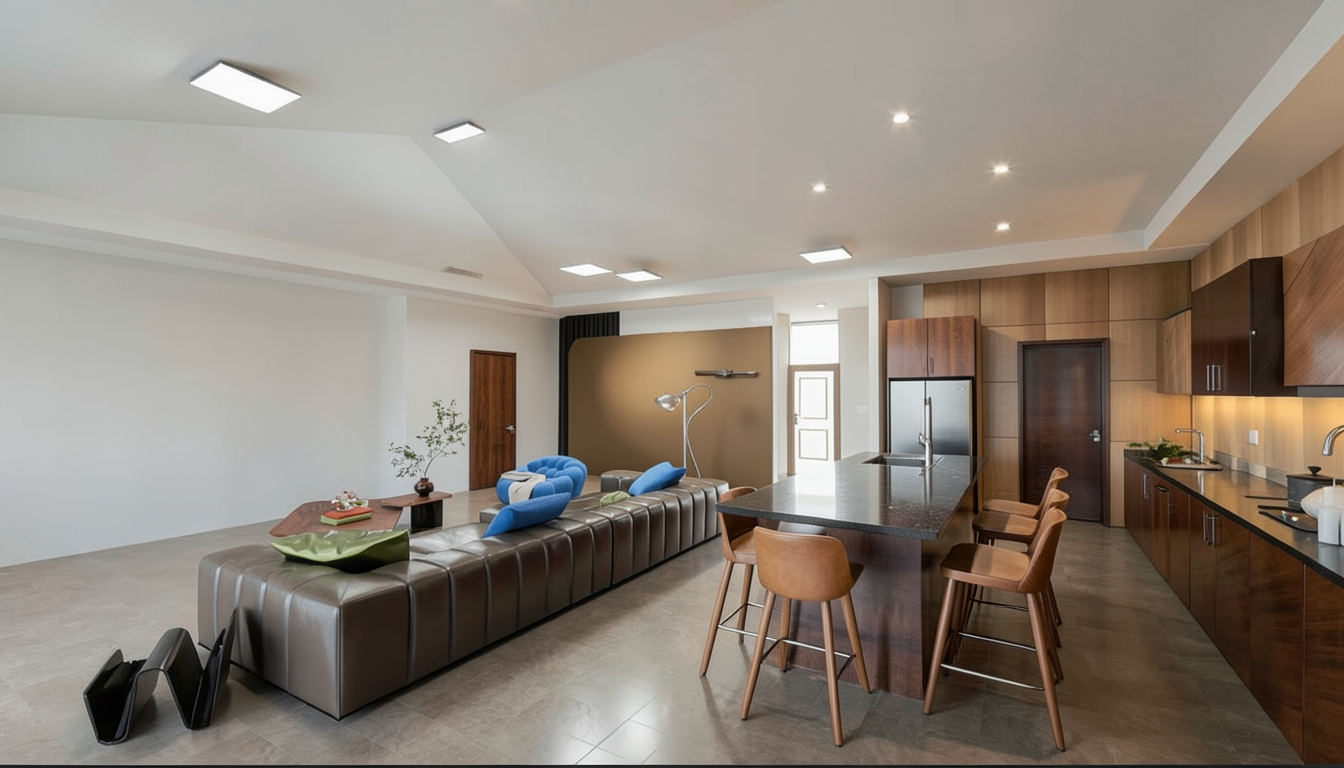 add 1 person preparing dinner at the island bench add natural lighting coming in from windows add kitchen decor