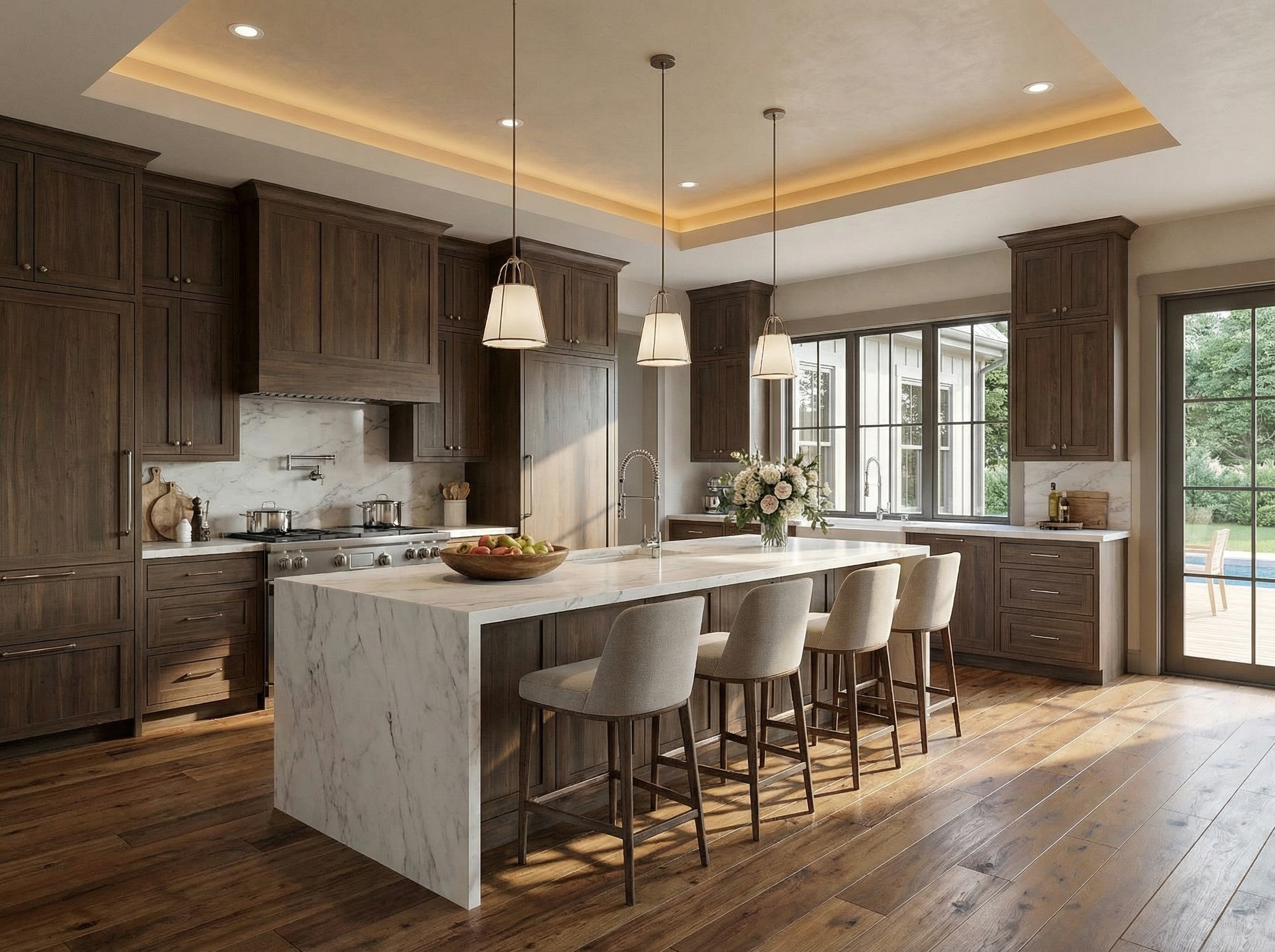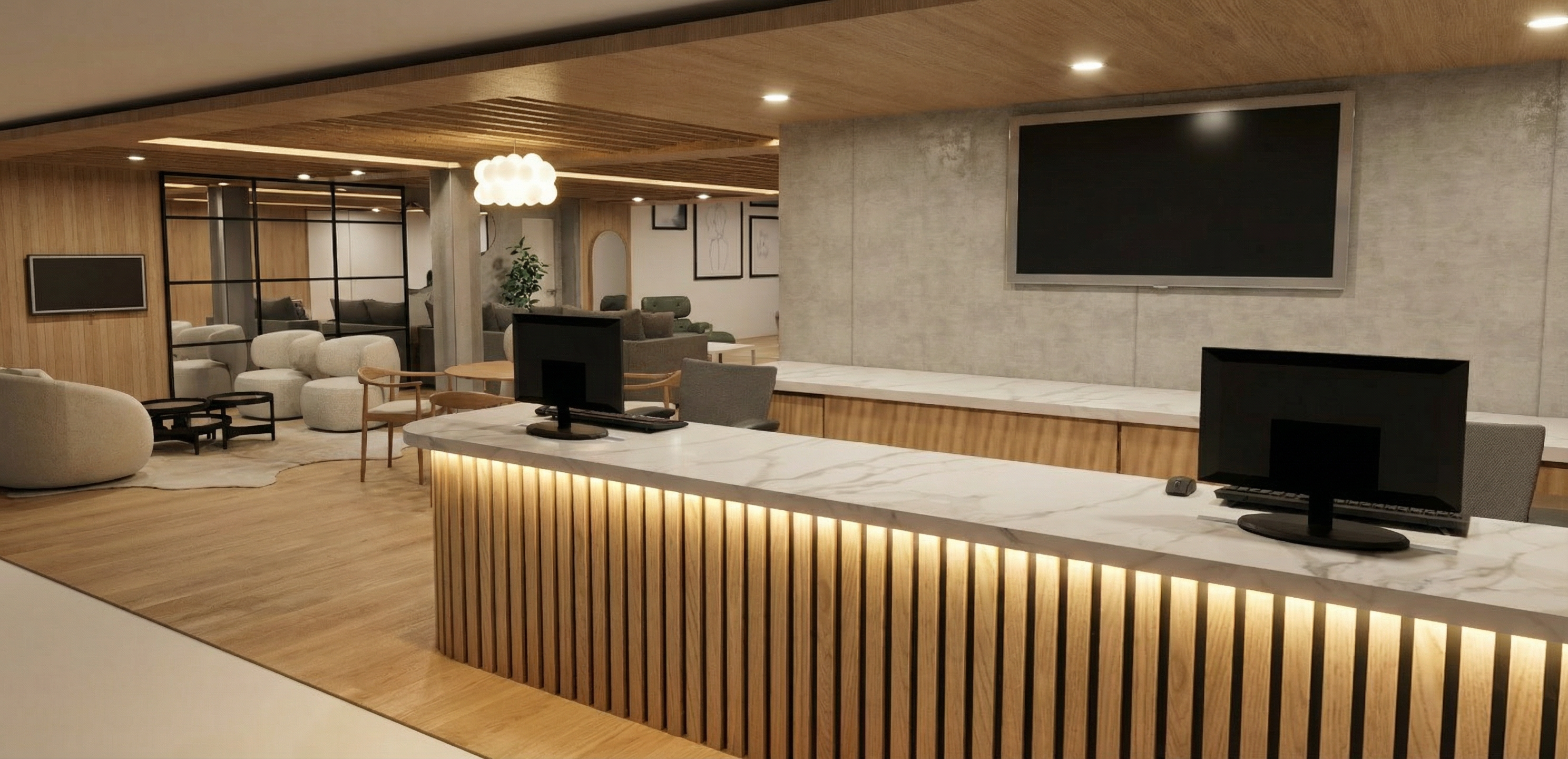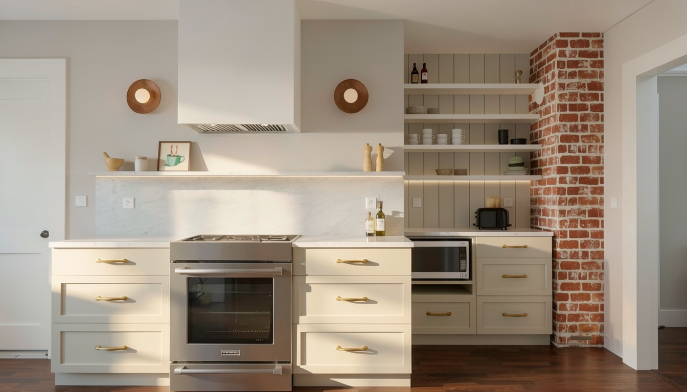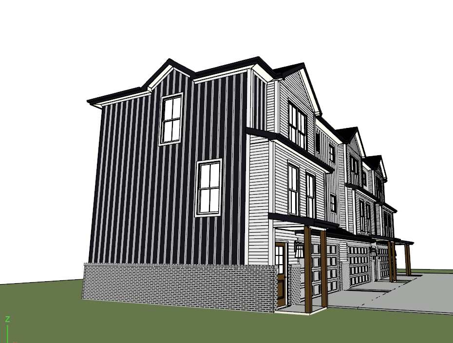 create a realistic 3d scene make the horizontal siding white the vertical siding a black wood vertical panel siding and the brick black