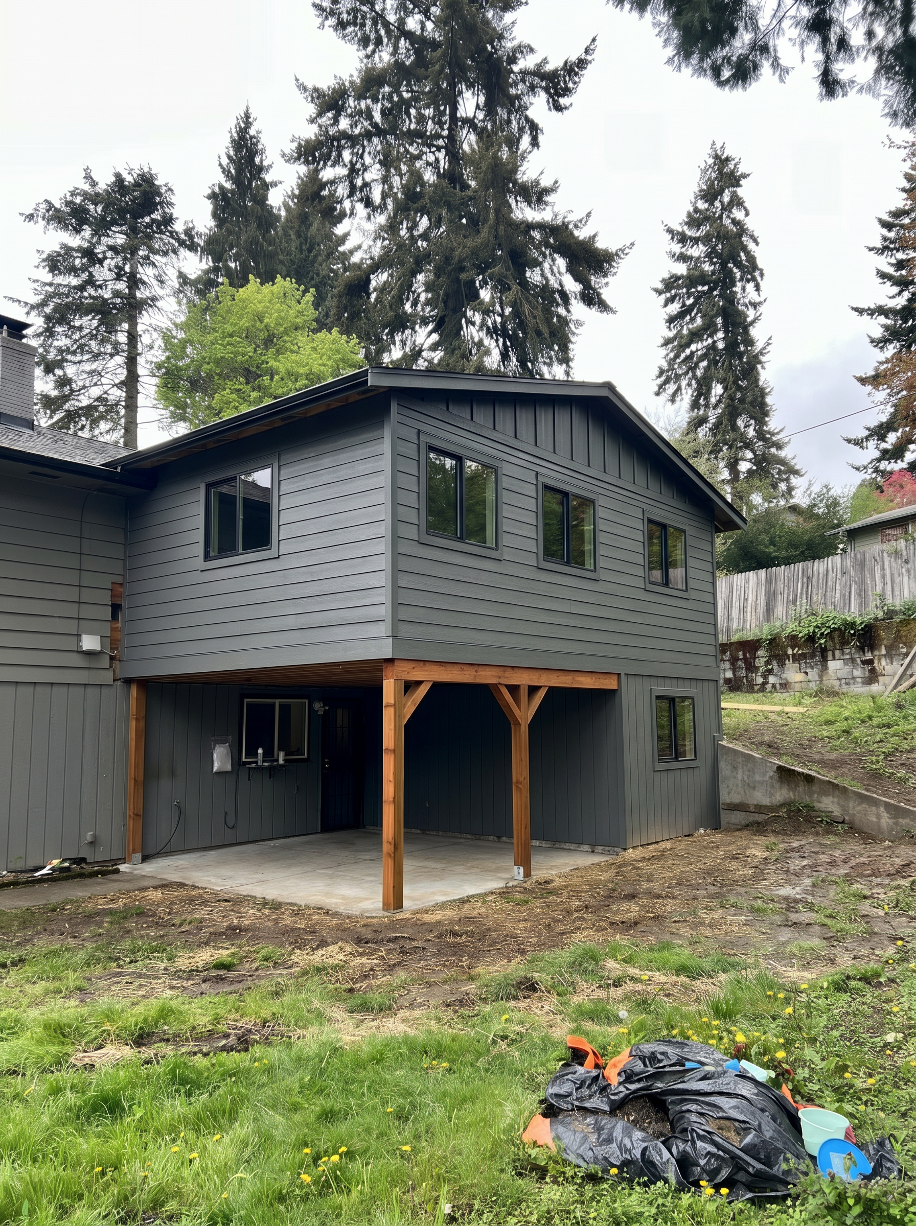 finish off this addition and replace the old siding to match the new dark grey lap siding with board batten accents stained cedar columns with 6x8 faux beam carrying the upper floor big windows