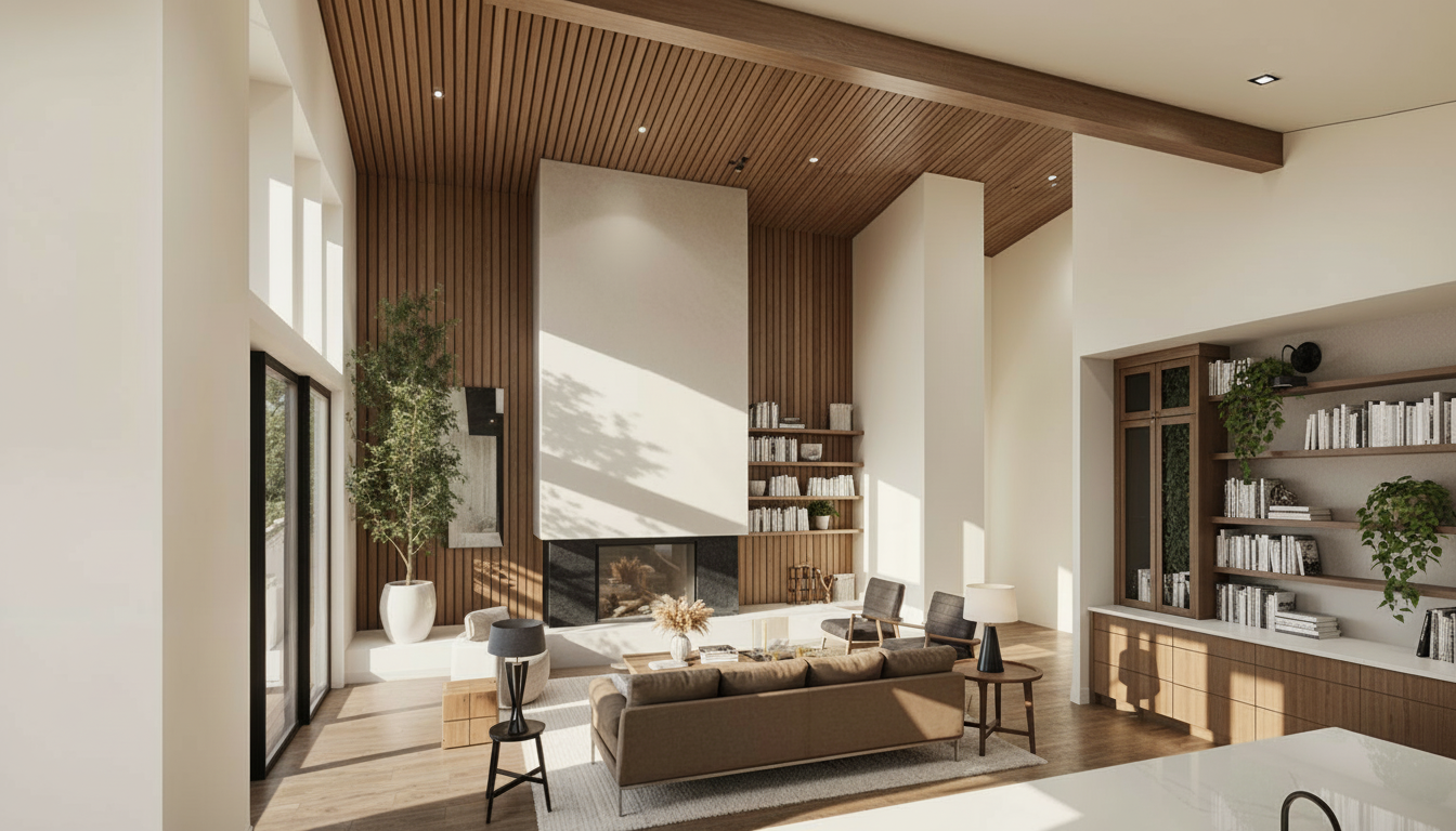 high end editorial architectural photography for vogue living a moody sophisticated kitchen and dining interior in toronto materials honed arabescato marble countertops with deep grey veining fluted light oak kitchen island and matte off white shaker cabinetry floor french oak chevron parquet with a matte wax finish furniture sculptural cognac leather bar stools and a dark walnut pedestal dining table lighting moody chiaroscuro atmosphere warm under cabinet led glow soft natural light filtering through sheer linen curtains and dramatic shadows cast by black designer spotlights details minimalist matte black fixtures integrated high end appliances and a sculptural black apparatus style chandelier follow the model geometry exactly for the lighting elements the back wall on the right is a custom millwork piece add a blurred person at the bar turn the globe lights over the bar on bright style ultra photorealistic 8k shot on 35mm lens f 11 aperture for deep focus cinematic lighting sharp architectural edges desaturated elegant color palette
