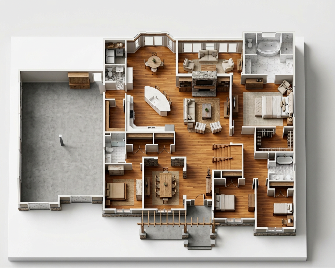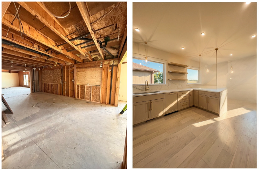 use the unfinished kitchen image as the base and lock its exact camera angle perspective framing and room geometry do not change viewpoint zoom or layout in any way keep all walls window positions and proportions exactly the same apply the finished kitchen image only as a style reference for materials and design insert cabinetry countertops and fixtures aligned precisely to the existing walls and window locations in the base image ensure the final result matches the exact composition of the original unfinished photo with no repositioning or distortion image to image transformation only no reinterpretation no redesign of layout no camera movement
