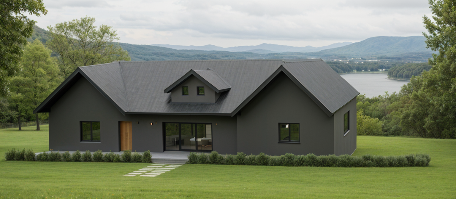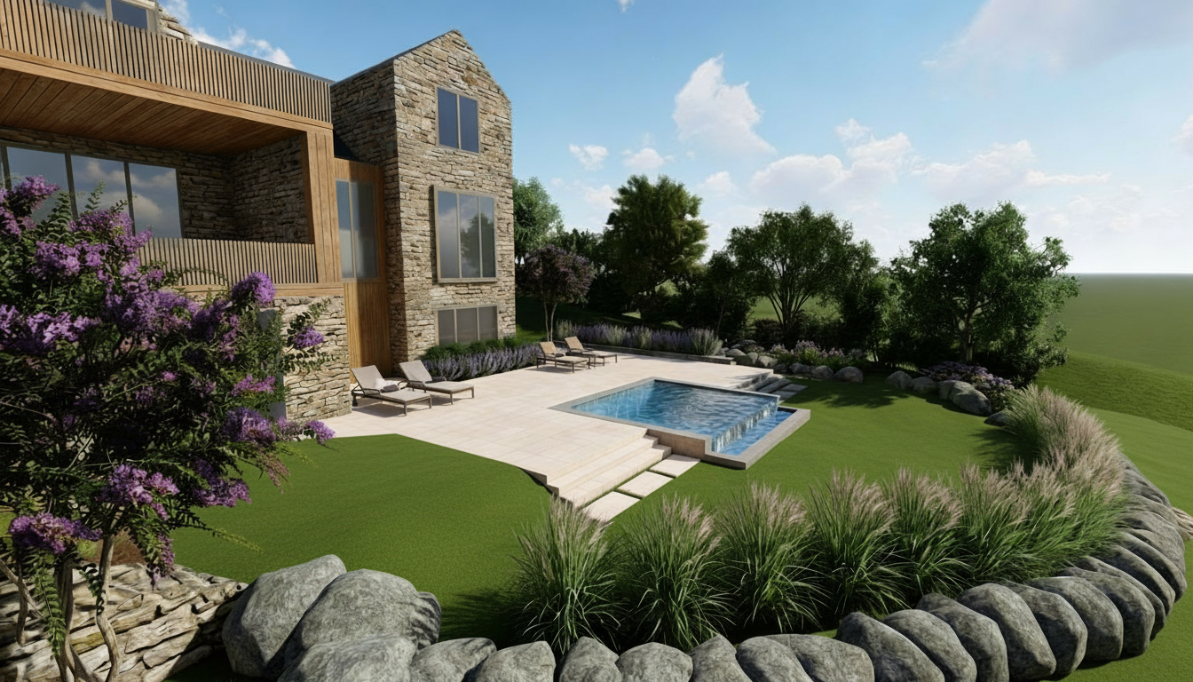 make more photorealistic adjust daylighting keep materials and form exact make the grass texture like it was just mowed