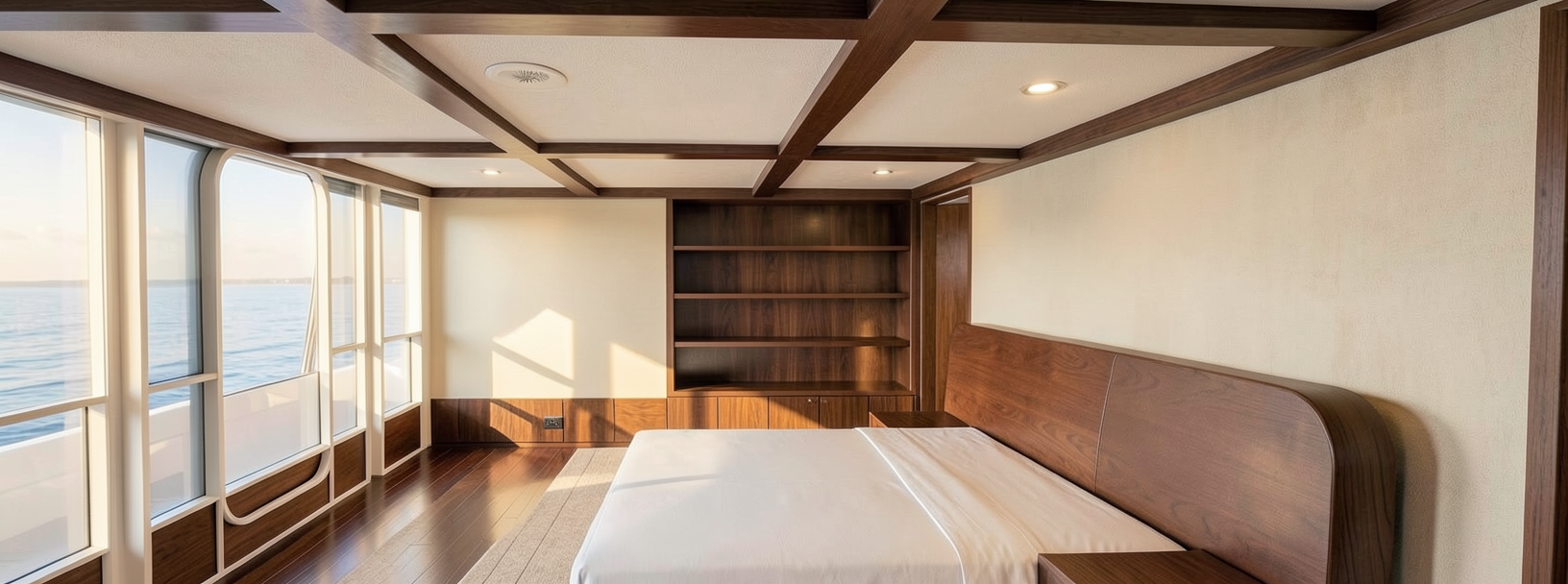 this is the main master bedroom of a luxury yacht the floor is dark wood and a beige rug there is a wood skirting but the wall is painted the headboard is wood