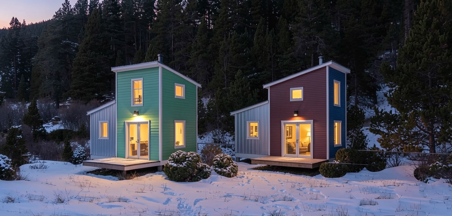 orange and blue cabins painted clapboard siding metal siding at forests edge colorado landscape snow on ground dusk with warm interior lighting snowy path to front decks