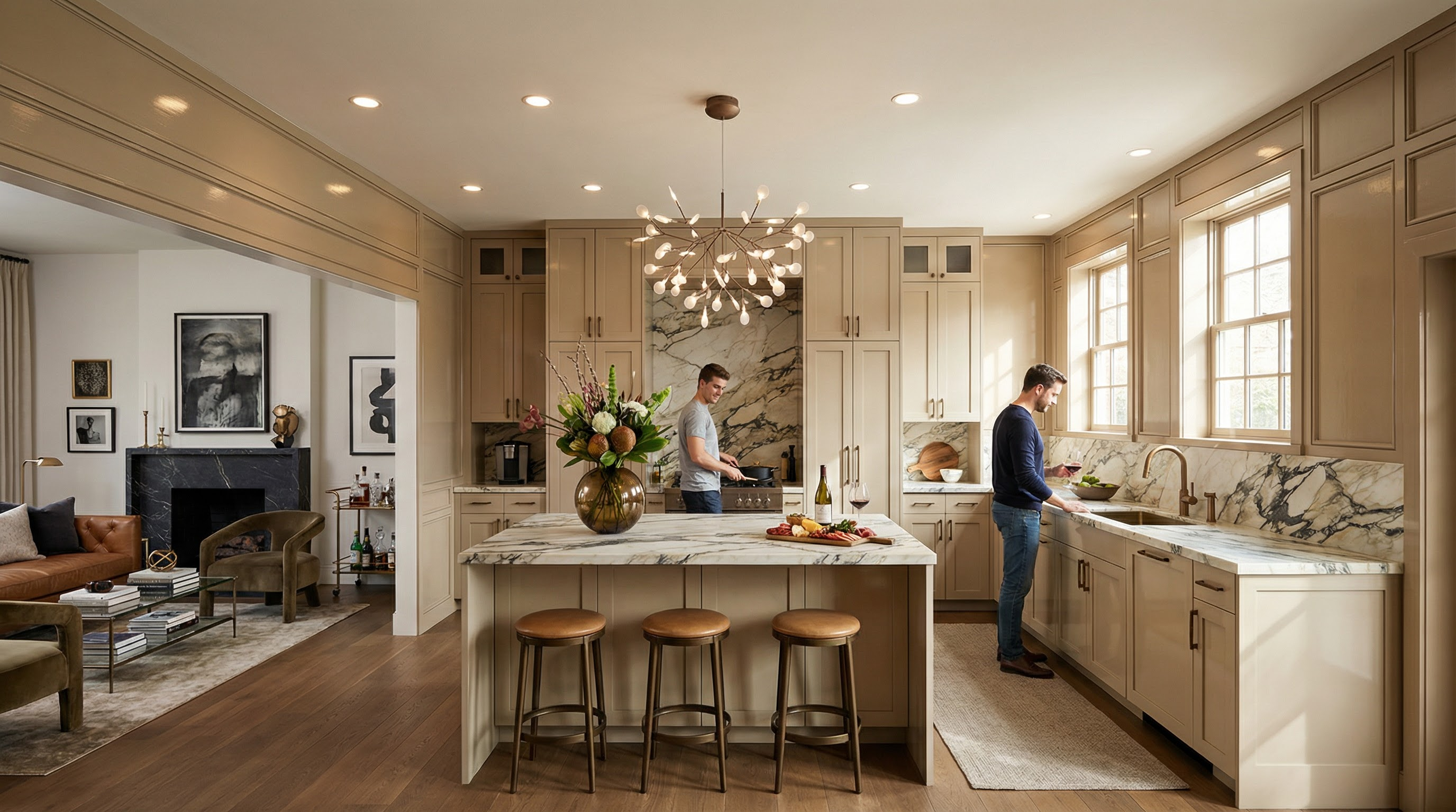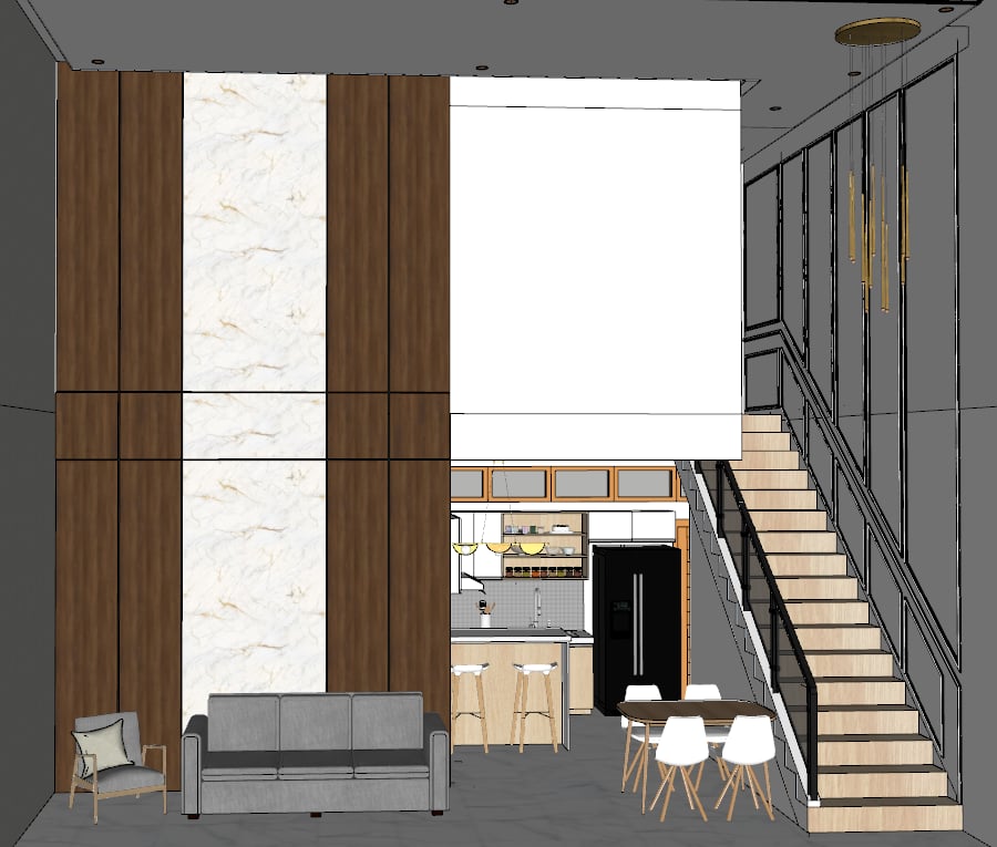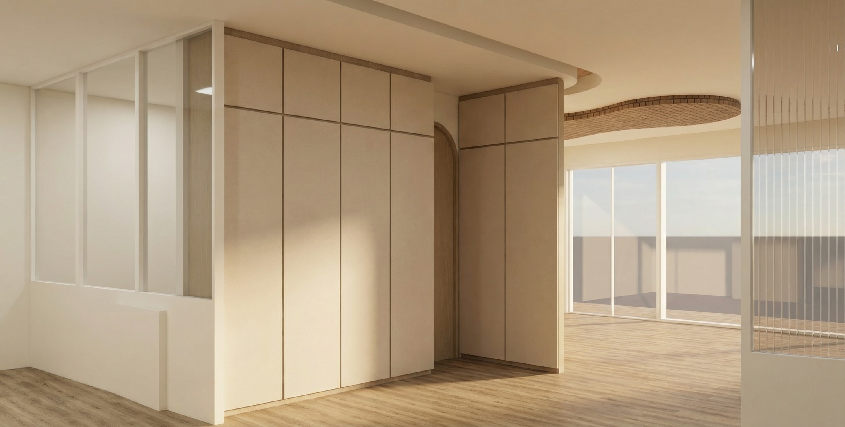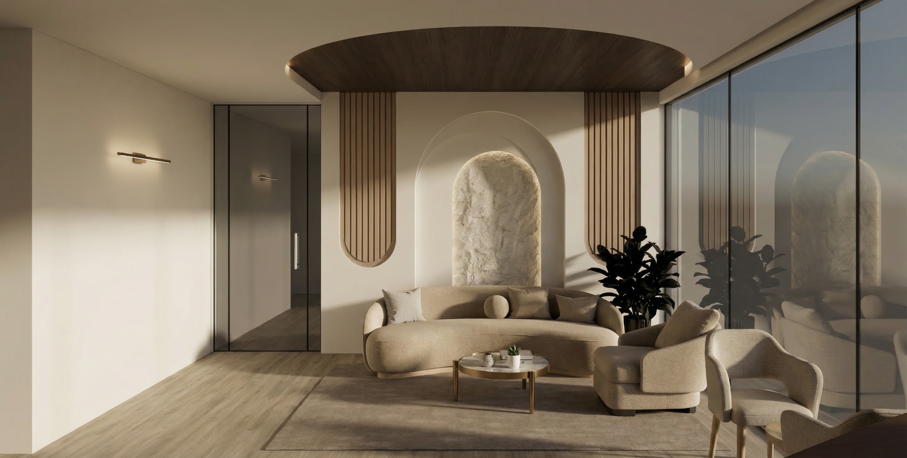 non negotiable rule geometry must be 100 identical do not change move resize distort add remove or reinterpret any architectural element this includes building massing roof forms walls openings windows doors frames railings balconies canopies proportions setbacks site layout levels stairs and edges the architecture must remain exactly the same as the reference image style mood clean calm scandinavian exterior aesthetic white or off white fa ades light oak birch wood accents soft gray warm neutral tones matte finishes natural textures minimal elegant uncluttered composition with marble floor the wainscoting is color white the left side wall is limewash cement finish remove the wainscoting render quality ultra realistic architectural visualization soft global illumination high resolution textures clean edges no painterly or illustrative style looks like a professional competition marketing render