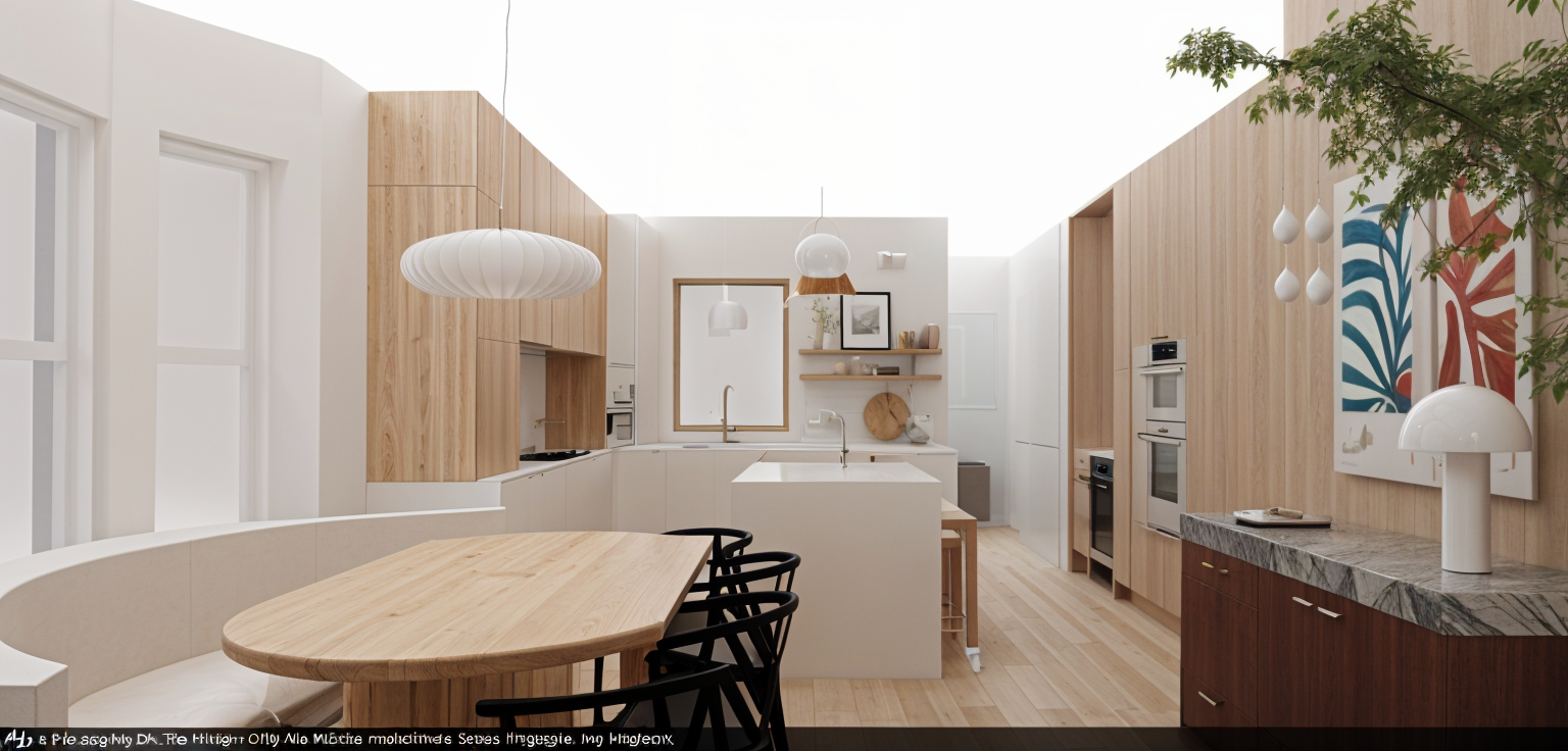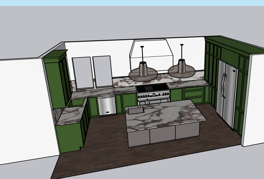 color the cabinets a dark forest green add a light grained wood floor a countertop surface and countertop backsplash with lots of veining make the hood vent a plaster finish and make all of the appliances a black stained steel finish add two large pendants above the island and a small pendant in front of each window in the corner