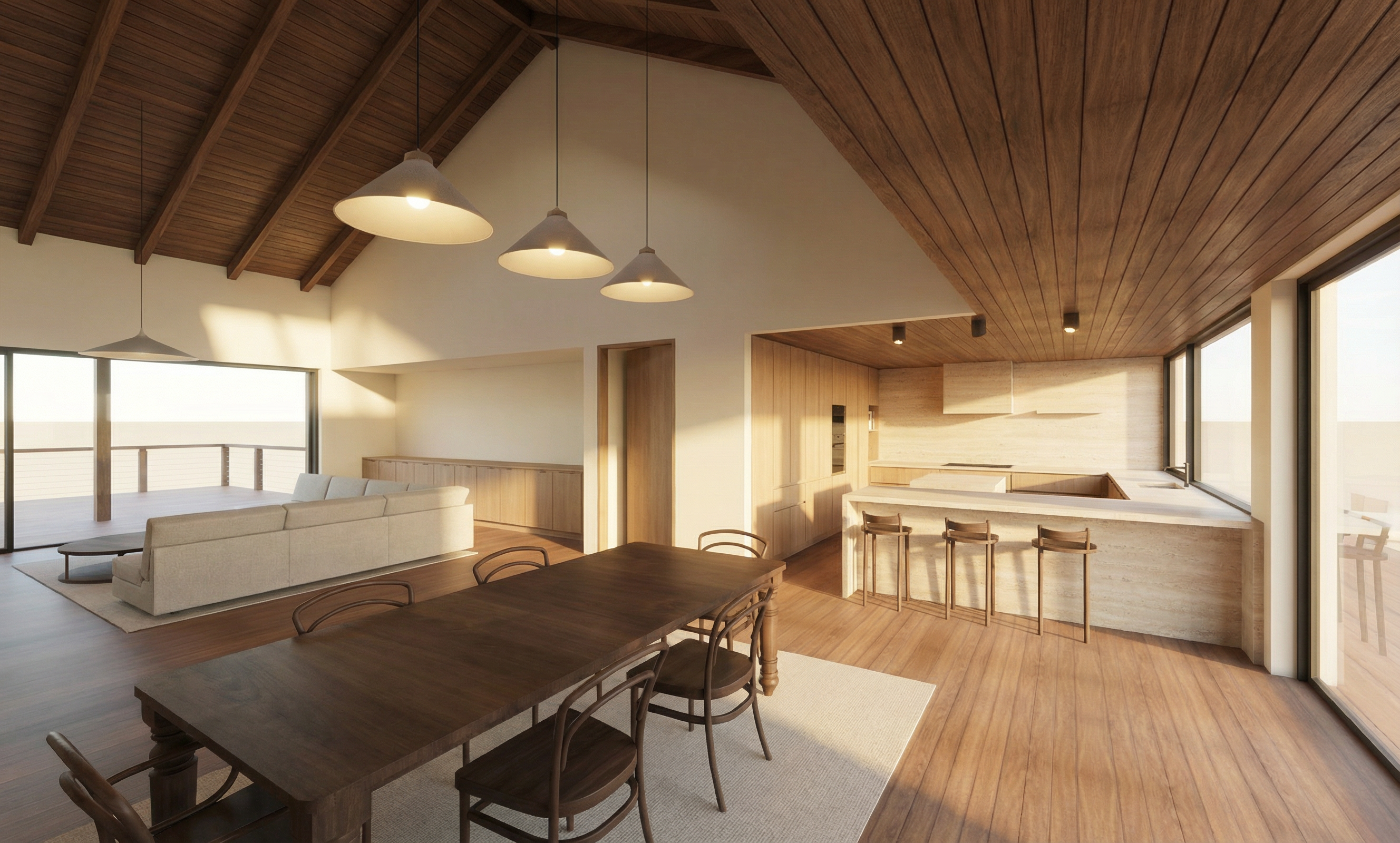 render a photorealistic 3d perspective of this house in a phoenix arizona reference the current material colors and style just enhance them dark grey flat seam metal roof and upper walls vertical black steel guardrail fins white oak wood siding on upper level horizontal white oak for garage lower level light warm grey stucco keep model geometry the same windows doors roof walls garage door concrete driveway do not change the view only enhance the current materials and make the landscape nicer vegetation detailed textures in the wood siding and glass reflections and a vibrant clear sky with light atmospheric depth render in hyper realistic architectural visualization quality 8k resolution