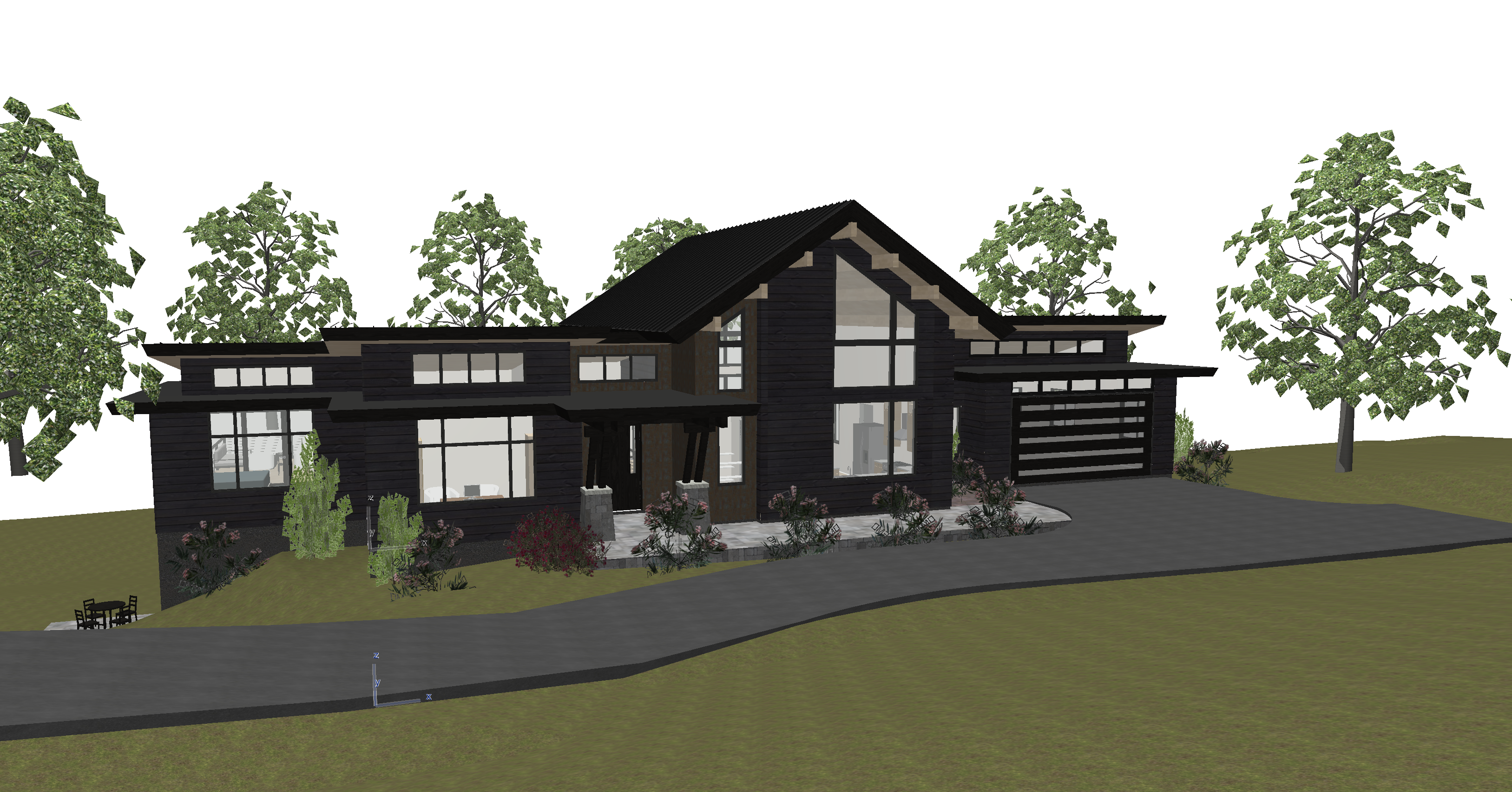 grainy watercolor render of modern home with black and medium tone wood siding surrounded by woods with landscaping around the house and an asphalt driveway architecture