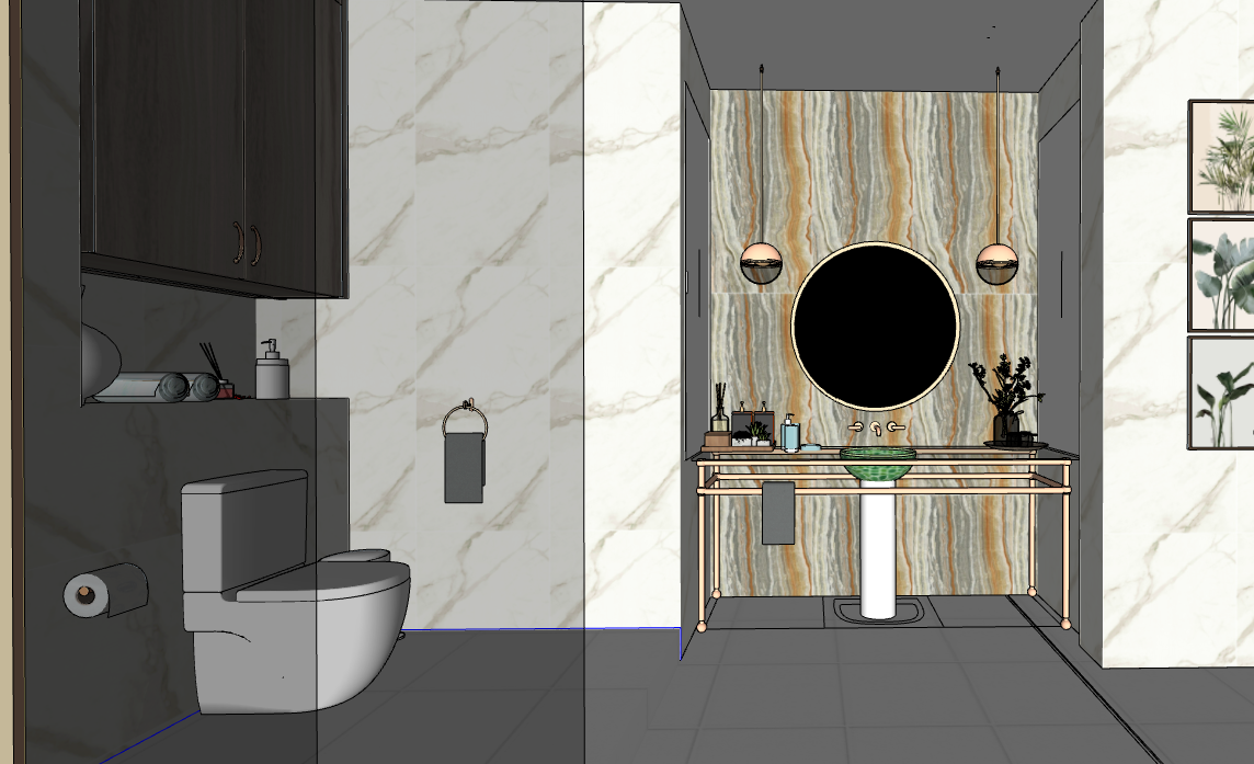 create a beautifully rendered modern bathroom use elegant marble textures for the walls with soft cream and white hues incorporate a feature wall with streaks of amber grey and white reminiscent of onyx add a sleek black circular mirror above a minimalist sink with a green translucent basin include stylish brass light fixtures on either side of the mirror casting warm inviting light the cabinetry should be a sophisticated dark wood with subtle metallic handles the floor should be a dark grey tile complementing the overall palette add hints of greenery with potted plants for a touch of nature maintain a calm and serene atmosphere