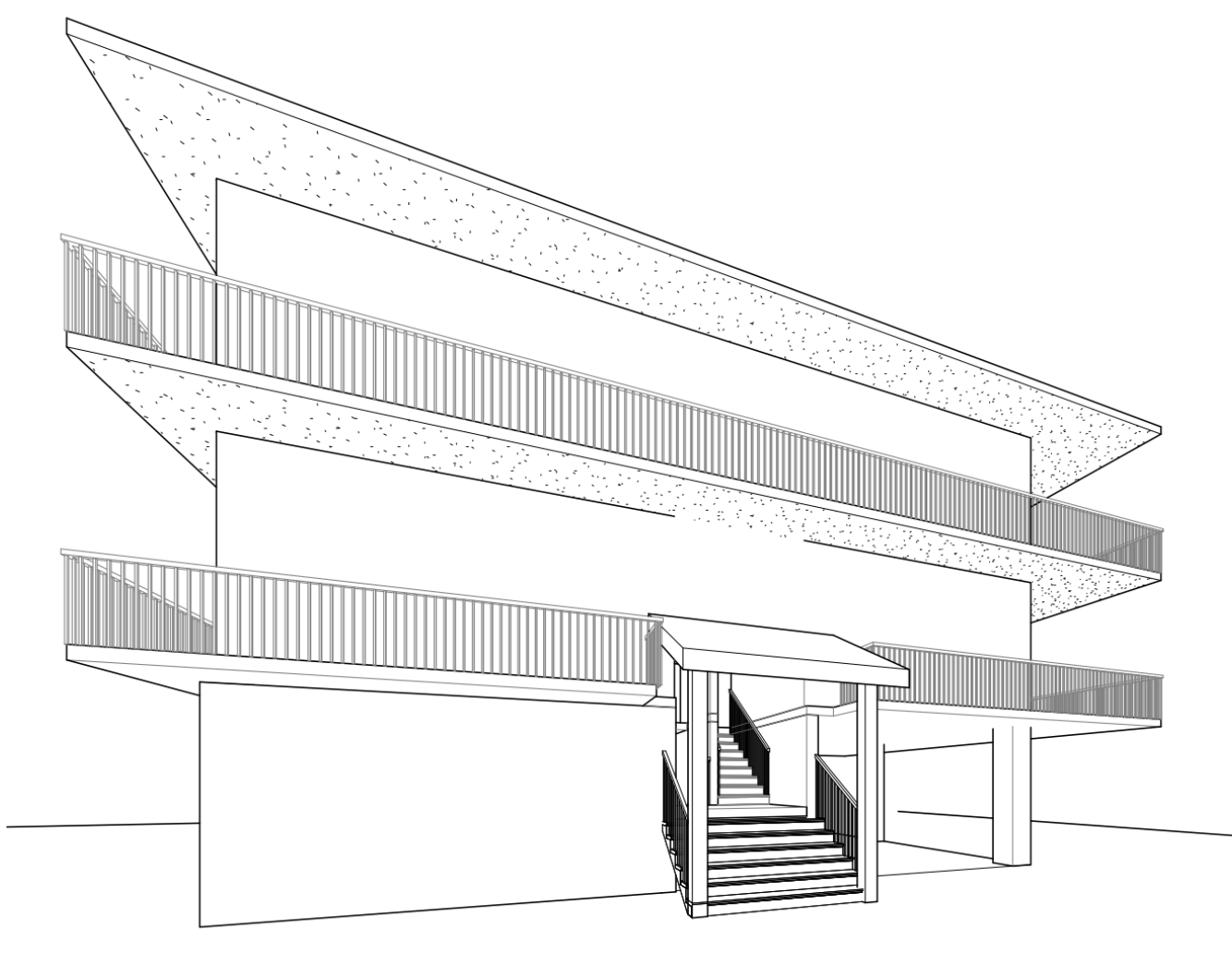 exterior shot yellow house with stainless steel railings short landscaping all around concrete construction with stucco and paint