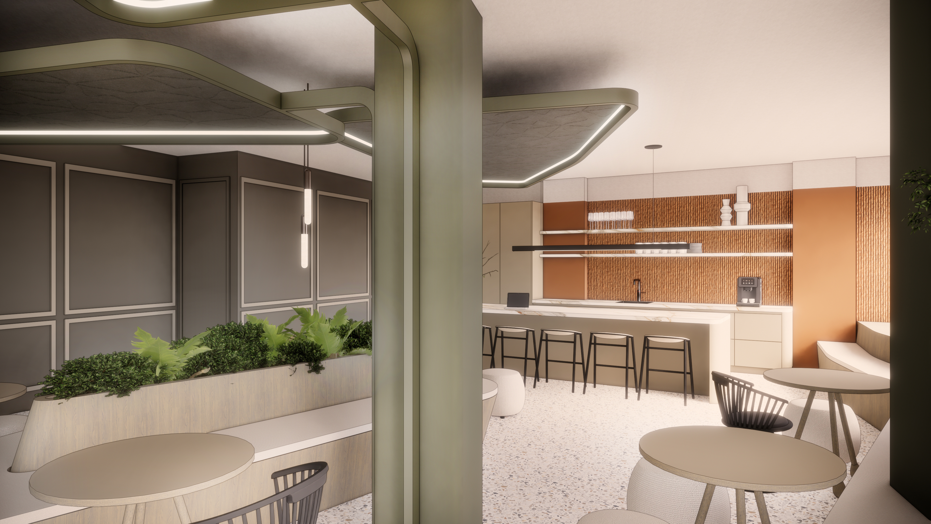 canopy lab vertaalt de dynamiek van de eindhovense markt naar een werkomgeving waarin binnen en buiten naadloos in elkaar overlopen ge nspireerd op het gevoel van zitten onder een parasol op het plein ontstaat een interieur waarin gestileerde canopies beschutting rust en sfeer brengen deze organische plafondvormen integreren licht en akoestiek waardoor een zachte comfortabele werkomgeving ontstaat waarin focus en ontmoeting in balans zijn de ruimte weerspiegelt de gelaagdheid van de markt zelf van levendige ontmoetingsplekken tot rustige werkzones donker houten volumes verwijzen naar de warme sfeer van de omliggende horeca terwijl vloeiende vormen en moderne detaillering zorgen voor een eigentijdse vertaling het sociale hart van het kantoor de lunchruimte fungeert als een binnenplein waar mensen samenkomen en de energie van de stad voelbaar blijft in materiaal en kleur sluit het ontwerp aan op de toekomstige inrichting van de markt met een zachte grijze basis en subtiele aardetinten die zijn afgeleid van de eindhovense bodem zo ontstaat een werkomgeving die niet alleen functioneert maar voelt als een natuurlijke verlenging van de stad een plek waar werken verblijven en ontmoeten samenkomen onder n canopy