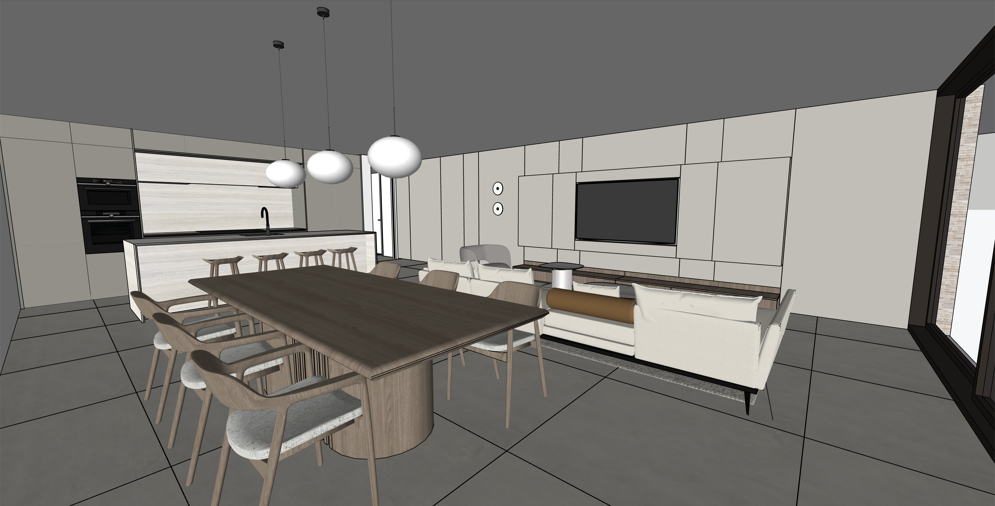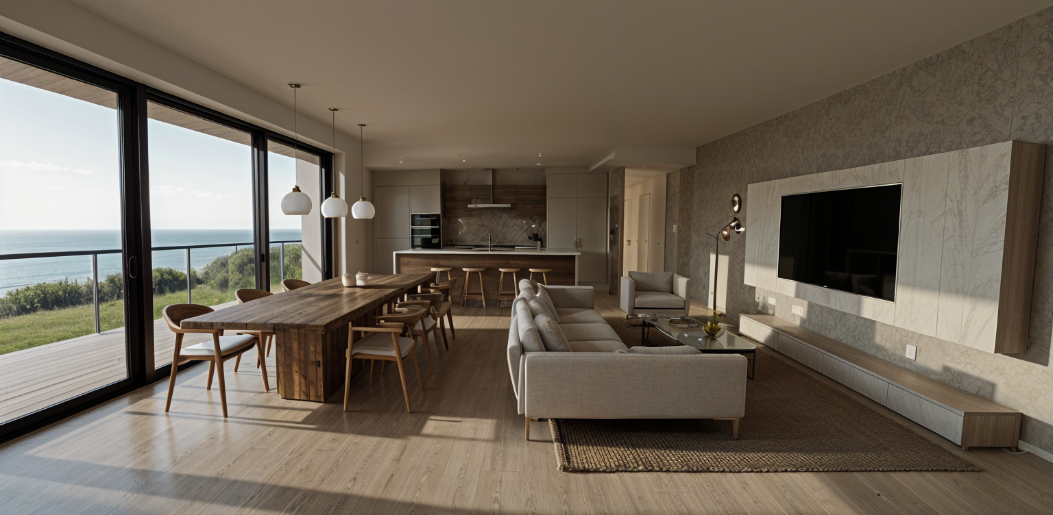 create a photorealistic image from the selected sketch the interior design style of modern minimalistic sea front property with realistic textures as seen on sketch add natural sunlight with contrast shadows keep the form of furniture as seen on the selected image but with realistic texture