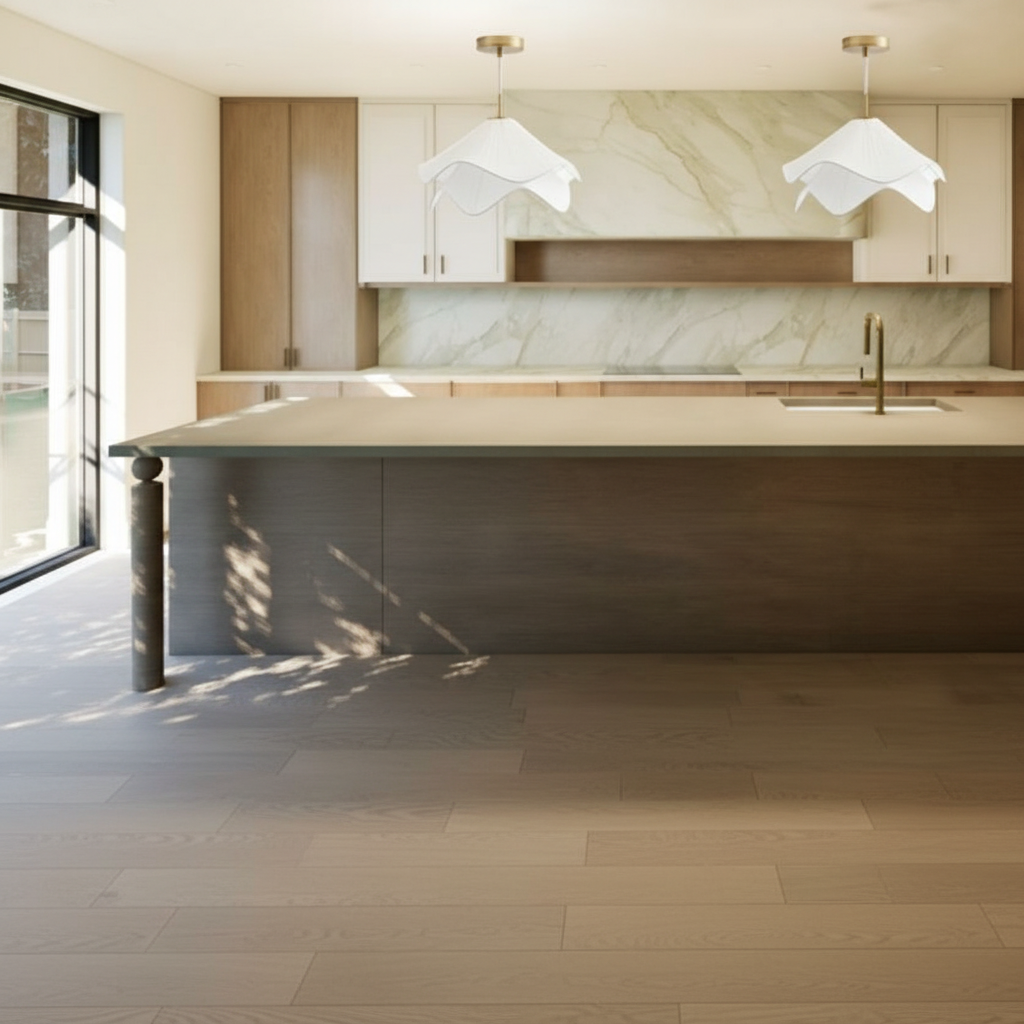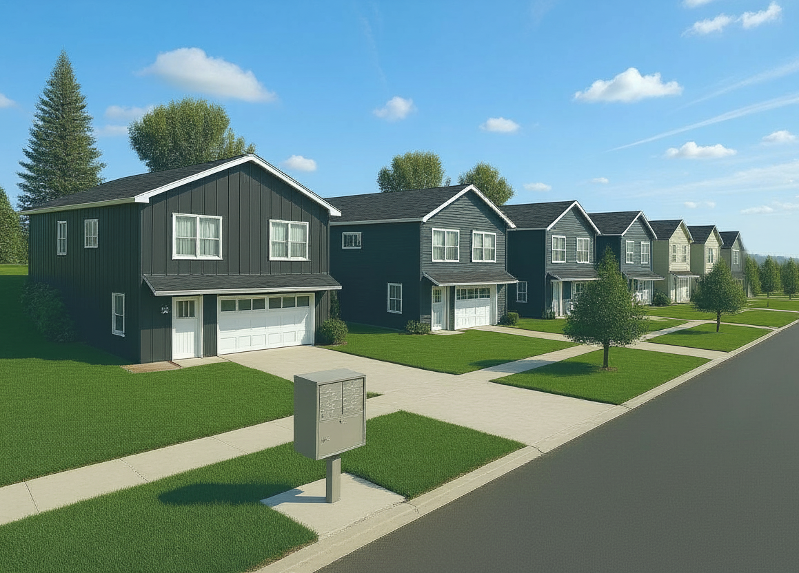 render a serene suburban neighborhood with modern houses each with similar tones of exteriors in shades of charcoal gray navy blue and olive green beige incorporate contrasting white trim around the windows and doors highlight neatly manicured lawns in a fresh vibrant green arrange the houses along a smooth asphalt road under a clear bright blue sky with fluffy white clouds create a peaceful inviting atmosphere with soft natural lighting and add lush tall trees in the background to enhance the tranquil suburban setting