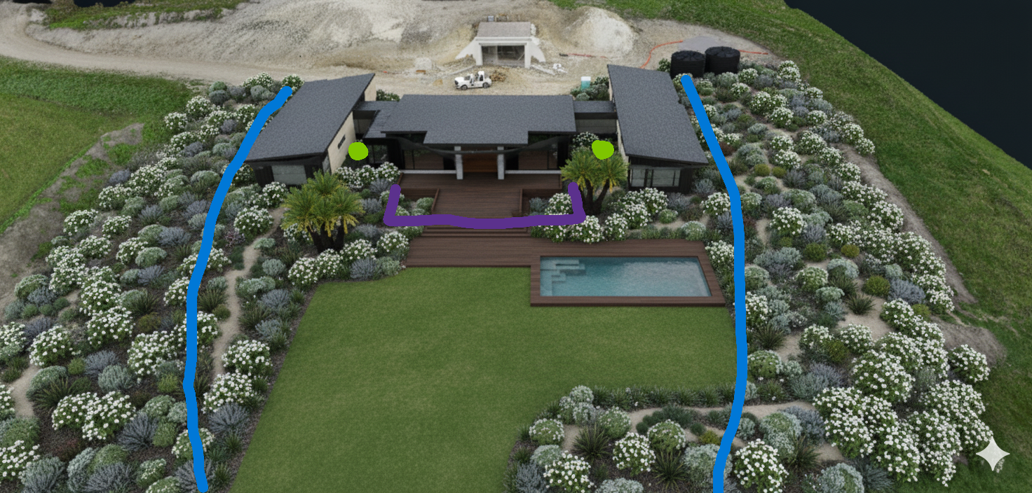 remove any planting between the blue lines and replace with lawn end the deck where the purple line is and make the pool the same height as the deck with an infinity edge on the nearest face move the xanthorrhea back to where the green dots are and reduce the size of them include low groundcover planting on the rear garage thats set back into the hill