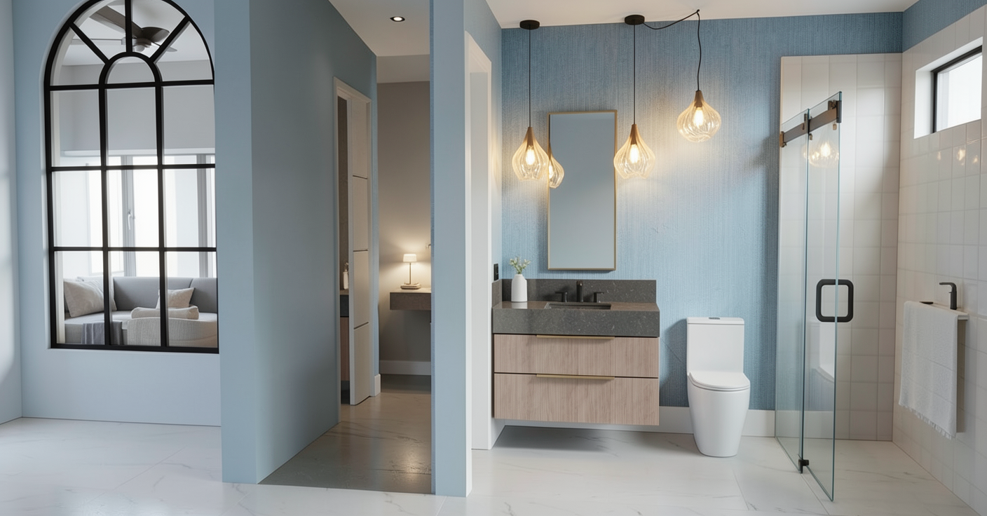 floating vanity toilet is not floating soft blue wallpaper 2 modern pendant lights wood tile floor