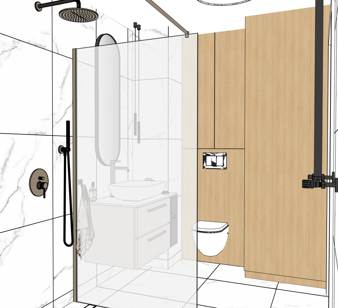 fotorealistyczna fotografia wn trza klasy premium projekt uk ad meble i materia y bez adnych zmian wzgl dem obrazu wej ciowego naturalne wiat o dzienne perfekcyjna ekspozycja naturalny balans bieli bardzo realistyczne materia y i detali zero zmian zero okien p ytki w ca ej azience wygl daj jak marmur z delikatn szar y k prysznic i bateria prysznicowa i umywalkowa jest w kolorze szczotkowany nikiel zlew i wc jest w kolorze bia ym obok lustra wisz dwie czarne w skie lampy lustro z czarn ramk z o wietleniem led za lustrem szafka umywalkowa jest w delikatnej szaro ci z czarnymi otwartymi p kami po prawej stronie jest czarny grzejnik zawie na nim dekoracyjny r cznik dope niaj cy przestrze drewno jest w kolorze egger vicenza przycisk wc jest w kolorze bia ym dodaj ma ego dekoracyjnego kwiatka na blacie po prawej stronie umywalki