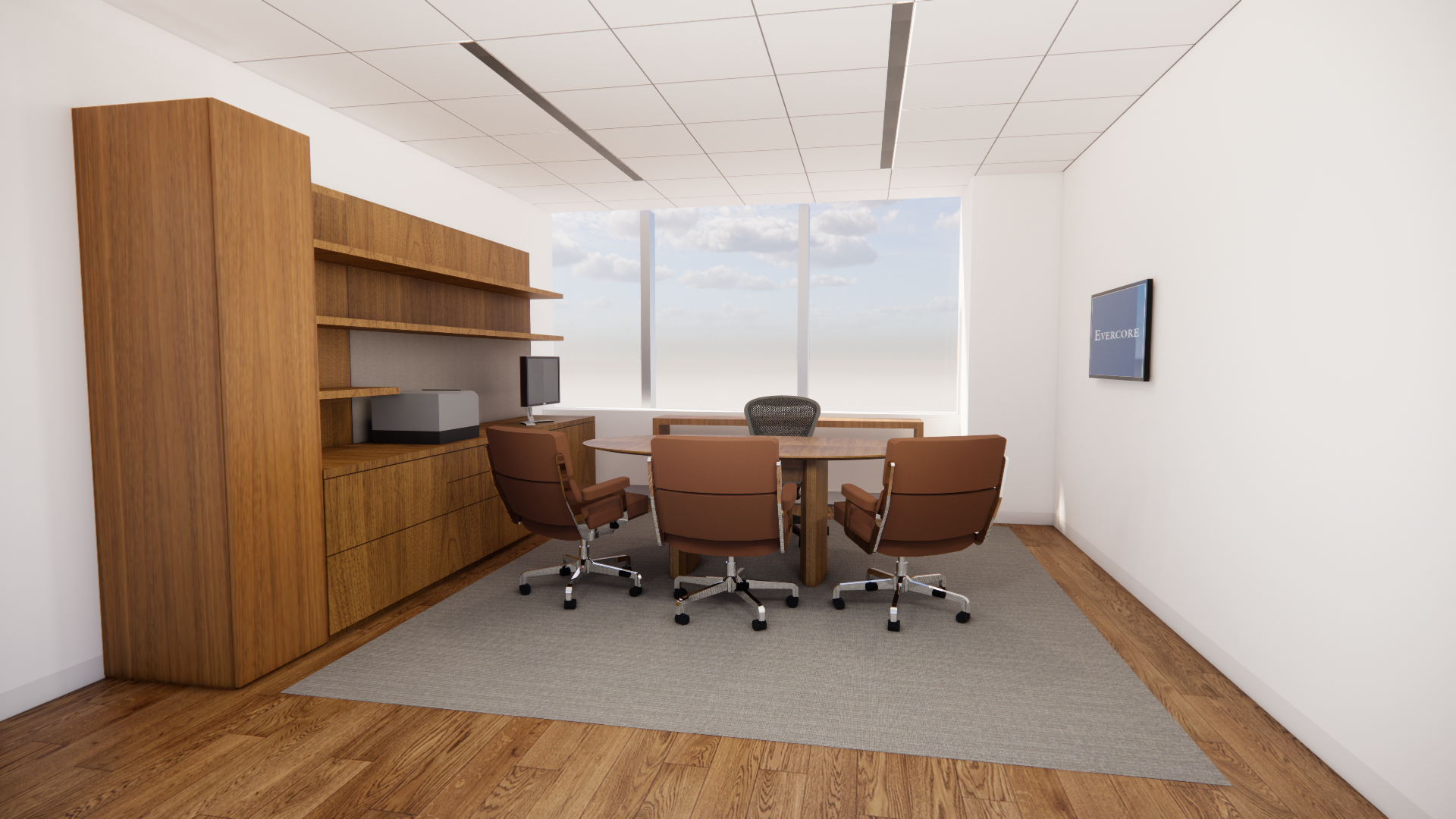 create a photorealistic rendering add midtown new york views from the 43rd floor keep all the elements proportions and finishes as they are add books and a plant on the shelves turn on two linear lights in the ceiling