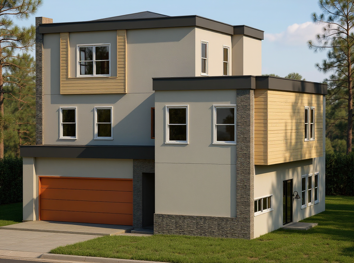 change the blue siding to gray paint the white trim black add a dog in the front yard architecture