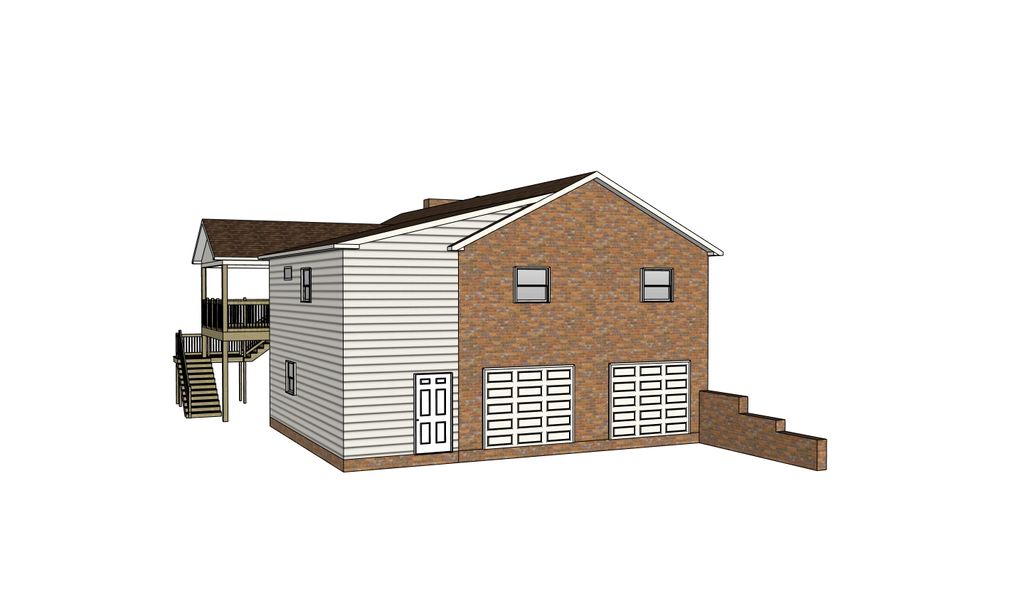 show the house in the curve of the road that goes behind and to the right side mature trees in the back and left side basement in front with asphalt driveway view to right with mountains in the distance left side has lap siding and the right has orange brick windows are white grass on the left and right side