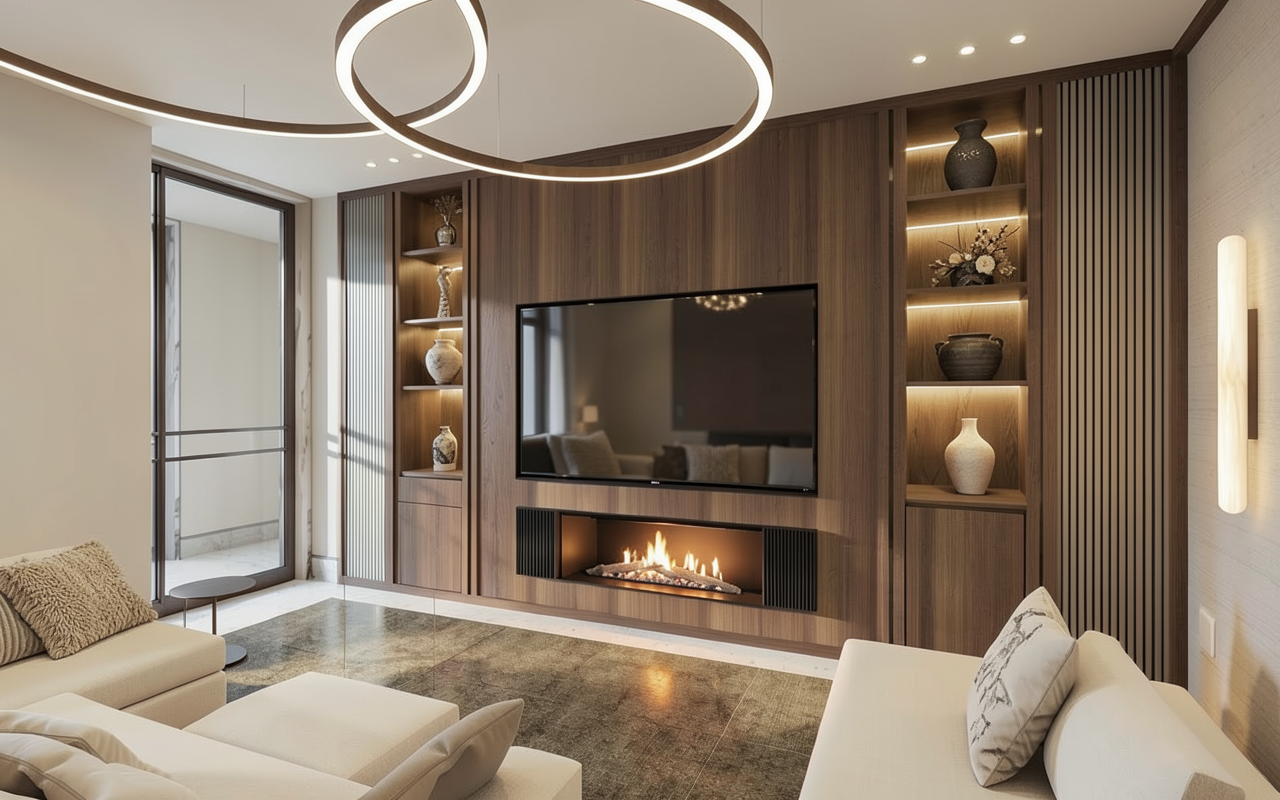 cozy luxurious television room place 5 design objects on the shelves make the fireplace look photorealistic give carpet soft feeling and do not change the color of it