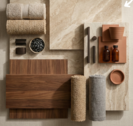 exterior shot create a high end interior design material moodboard using only the materials present in the 3d scene arrange the samples in an artistic layered composition similar to luxury architectural boards with realistic textures shadows and soft studio lighting include stone wood fabric metal and color swatches exactly as they appear in the scene presented as physical material tiles and samples use a refined neutral background elegant styling and balanced layout to achieve a premium photorealistic moodboard aesthetic