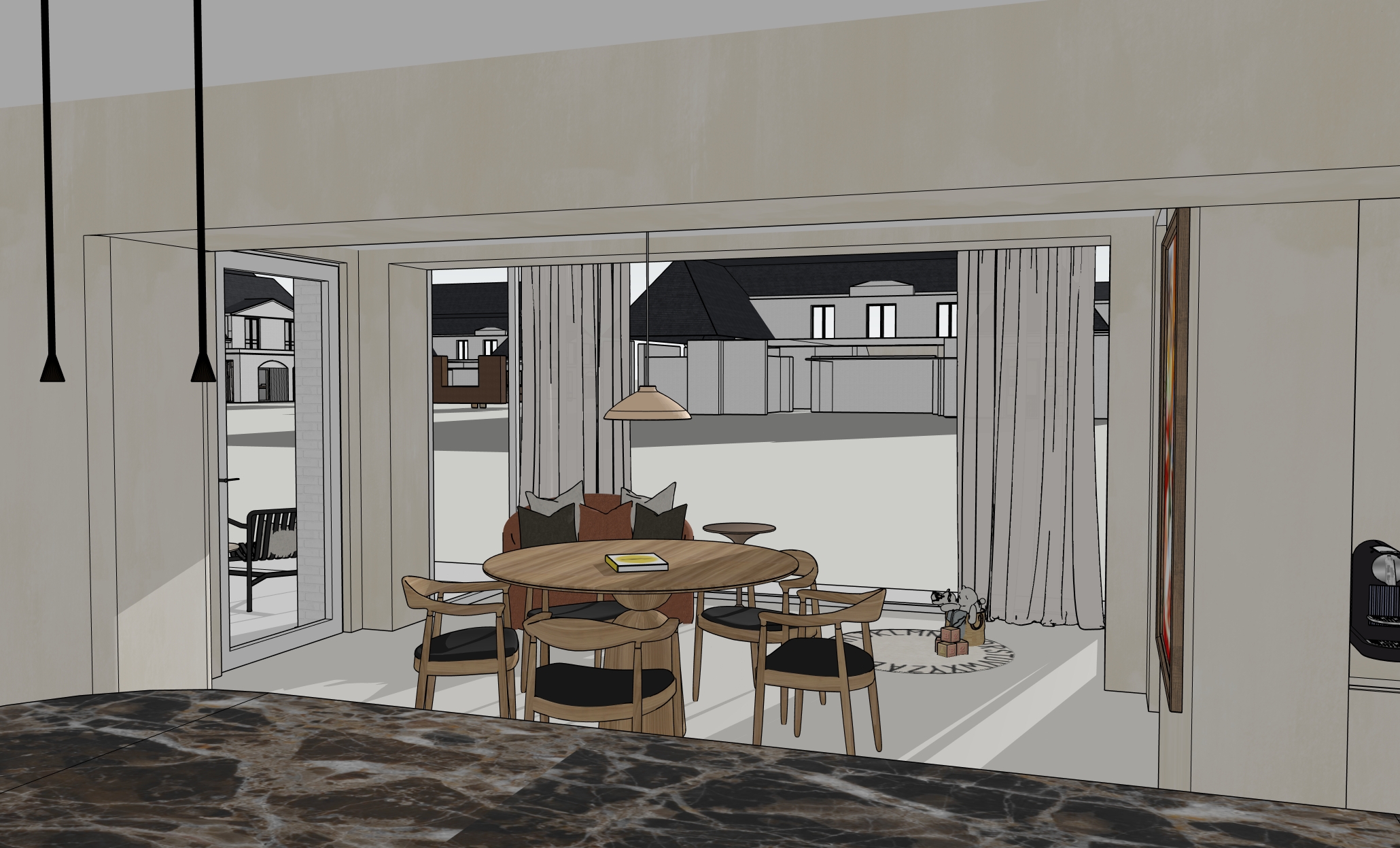 highly realistic interior rendering the countertop is made of dark brown marble with rich natural veining and a polished finish the kitchen island features a smooth curved form finished in refined bronze material with subtle metallic reflections the dining table and chairs are made of light oak wood with a natural warm tone the walls are finished in a white beige limewash with a soft textured appearance the floor consists of large format light gray tiles with clean joints preserve the existing proportions materials and overall composition of the space warm natural daylight enhances the materials creating soft highlights and realistic shadows contemporary elegant atmosphere high detail