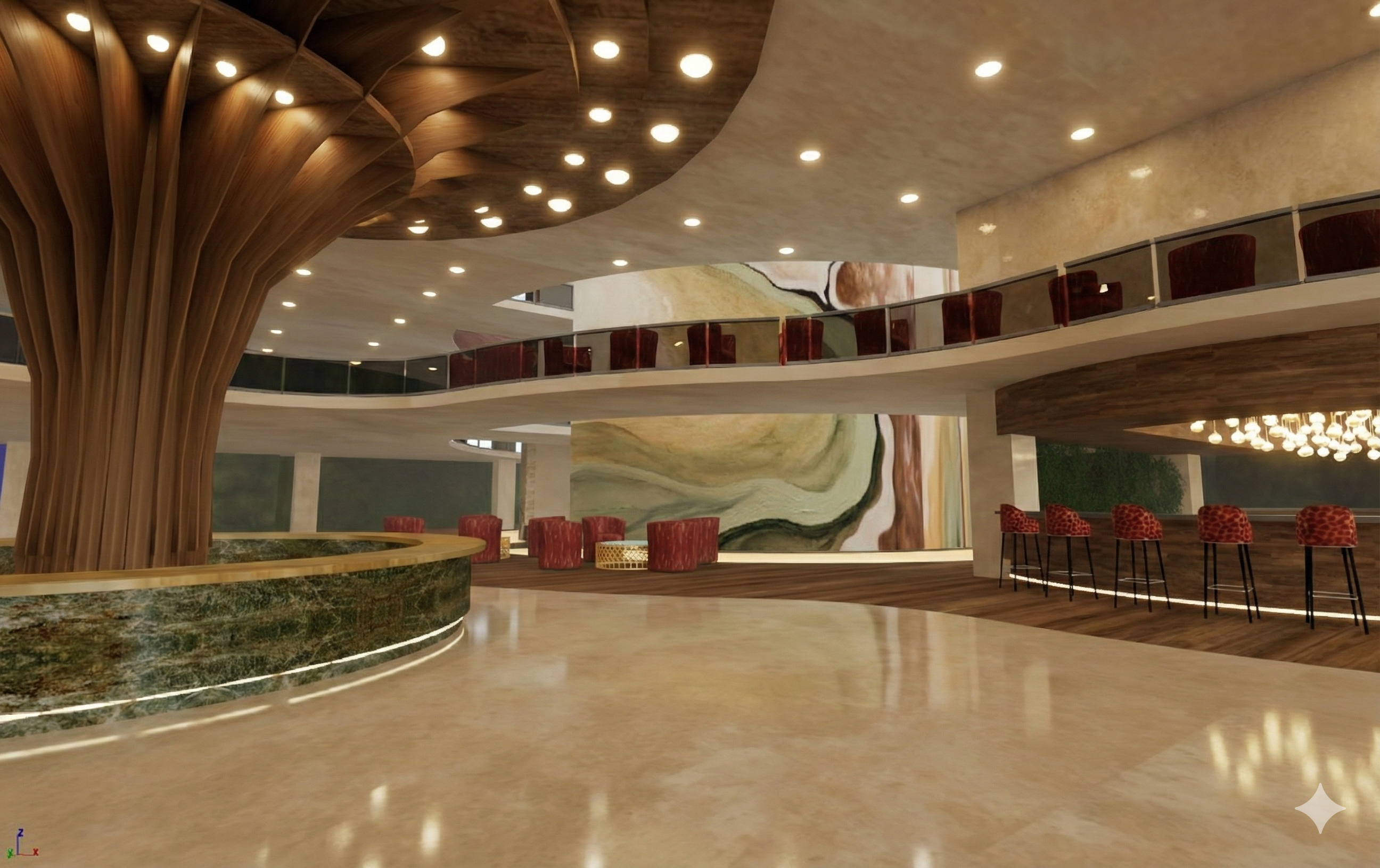 keeping the exact same architecture materials and overall design add the finishing touches to this rendering of a luxury hotel lobby you can add plants around the large marble tube in the back behind the red chairs and around the bending corner add a fabric texture to the upholstered seating